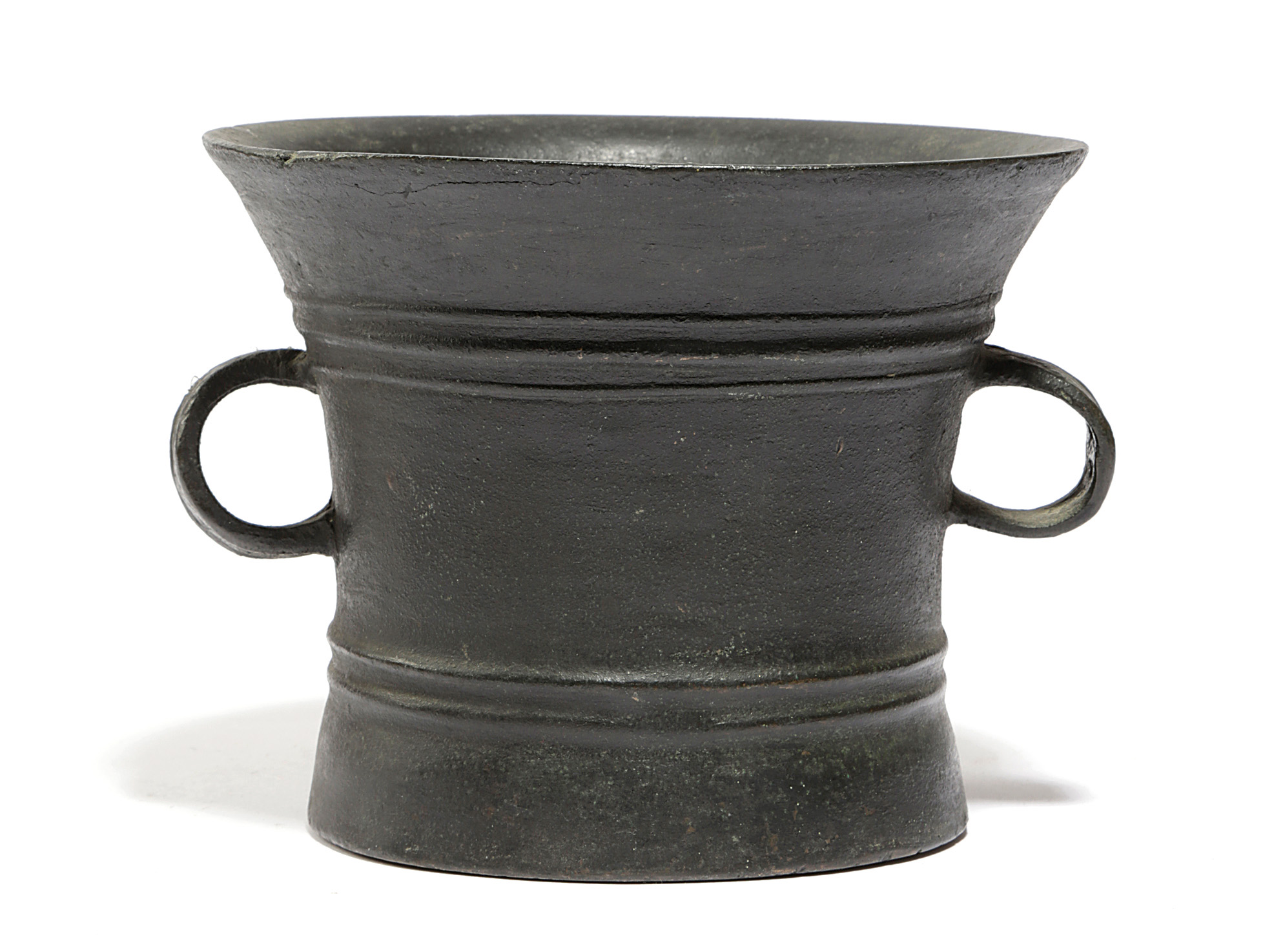 crisply cast and decorated with reeded bands and with a pair of lug handles, unmarked