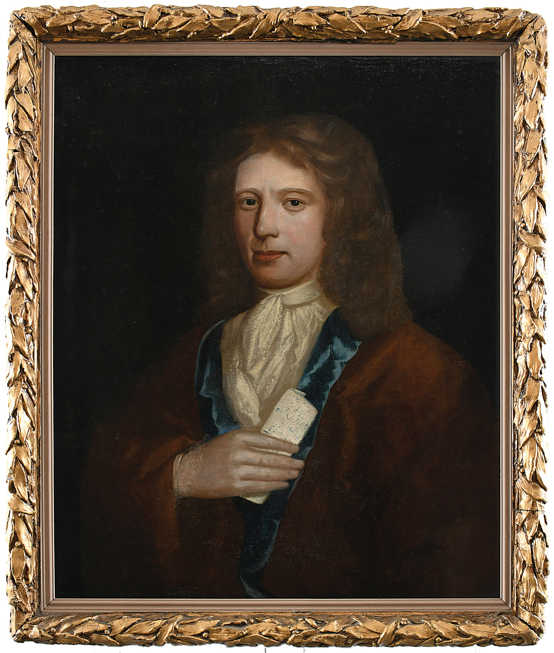 Portrait of a gentleman, half-length, wearing a brown coat with blue lining, and holding a letter