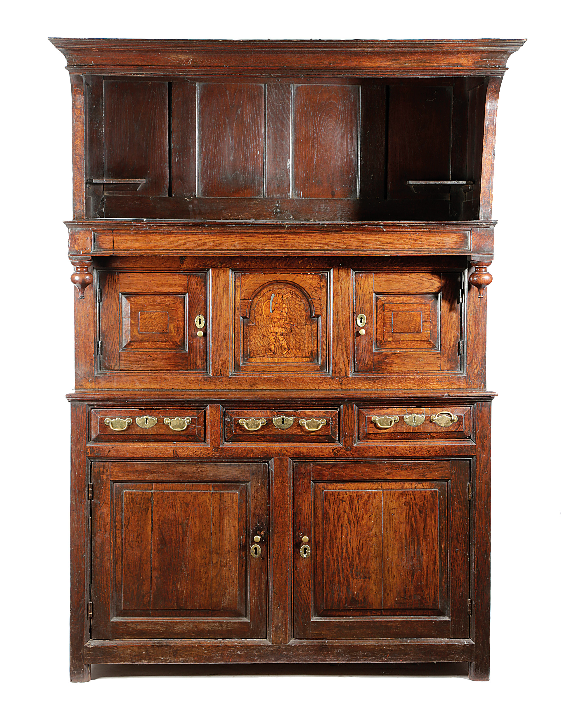 inlaid with burr oak panels, the canapeed top with two corner shelves, above turned pendants, above a pair of fielded panelled doors flanking a central arched panel, inlaid with an armour clad knight holding a shield and a sword, above three frieze drawers and a pair of doors enclosing a shelf