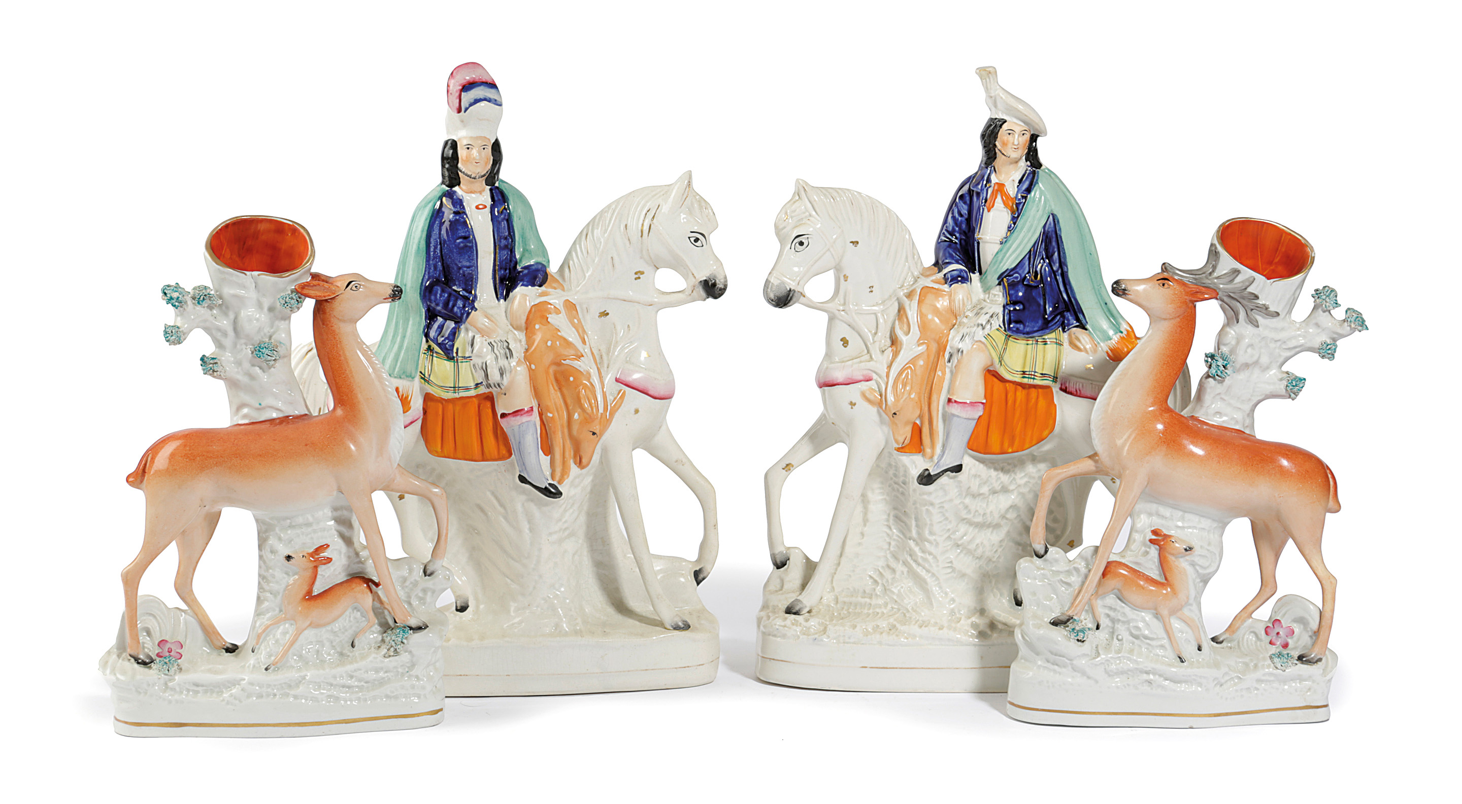 comprising: a pair of spill vases, modelled with deer and fawns, with gilt line bases together with a pair of Scottish Highland equestrian groups (4)
