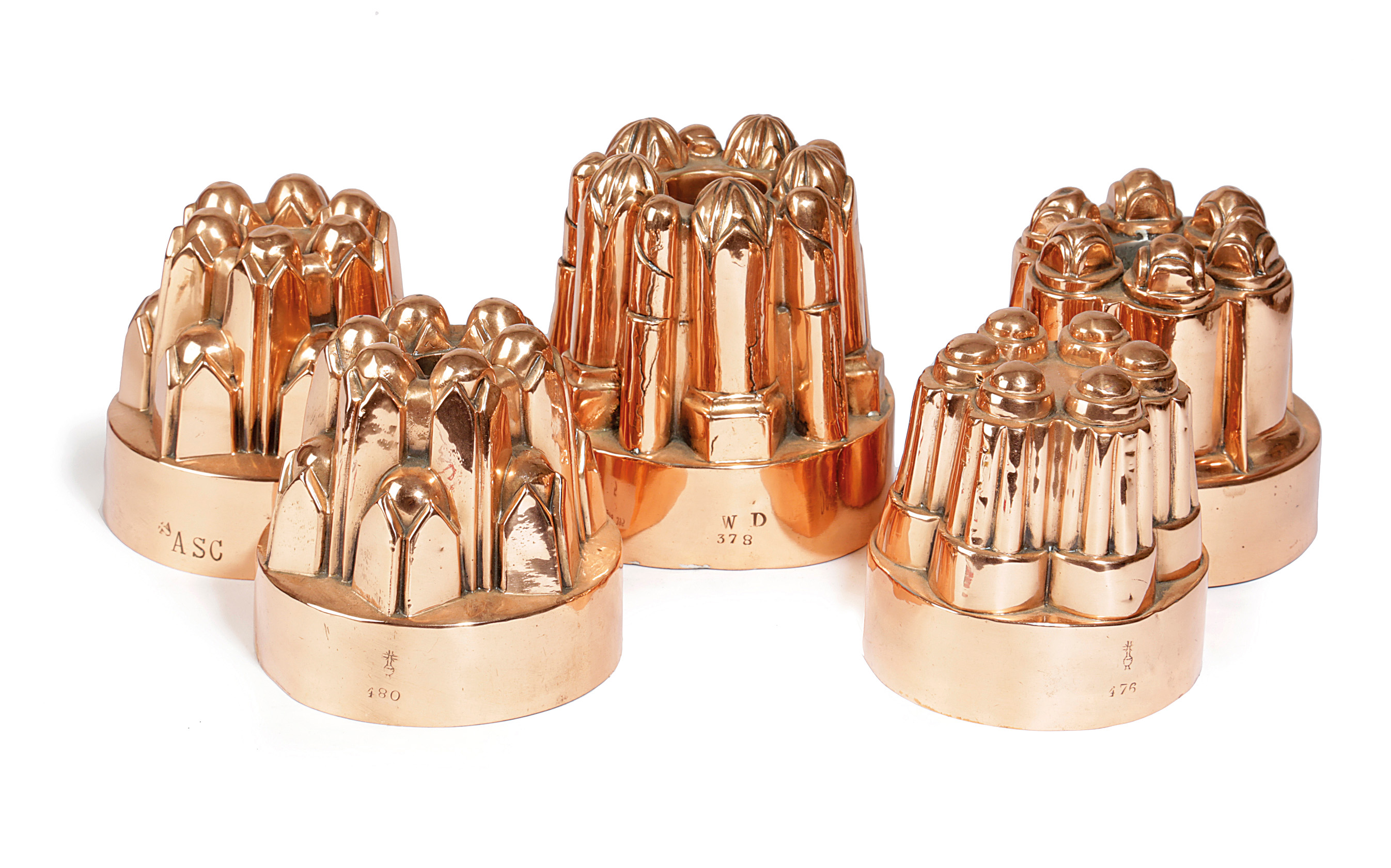 FIVE VICTORIAN COPPER JELLY MOULDS