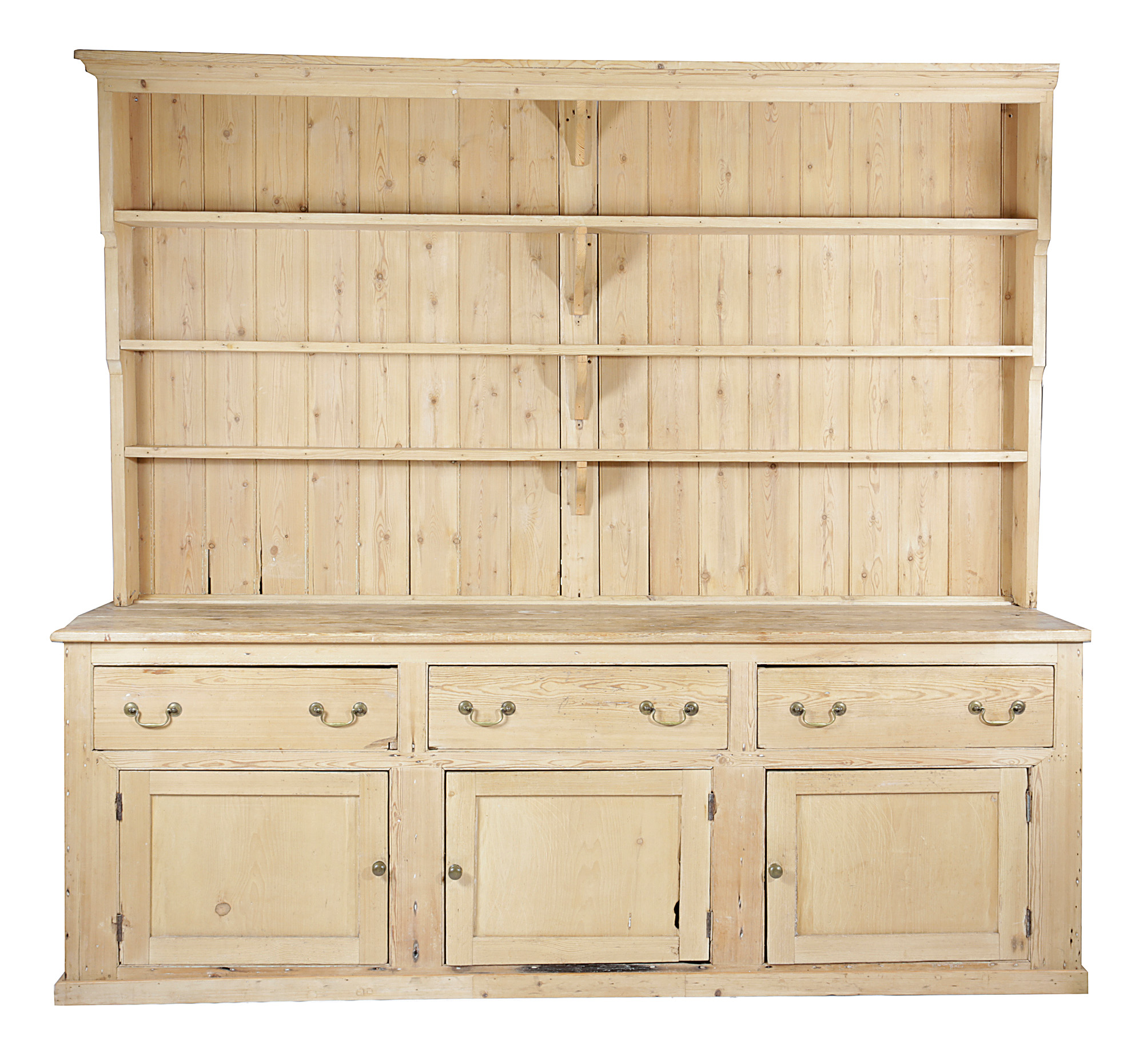the later plate rack with three shelves, the base with three frieze drawers, above panelled cupboard doors