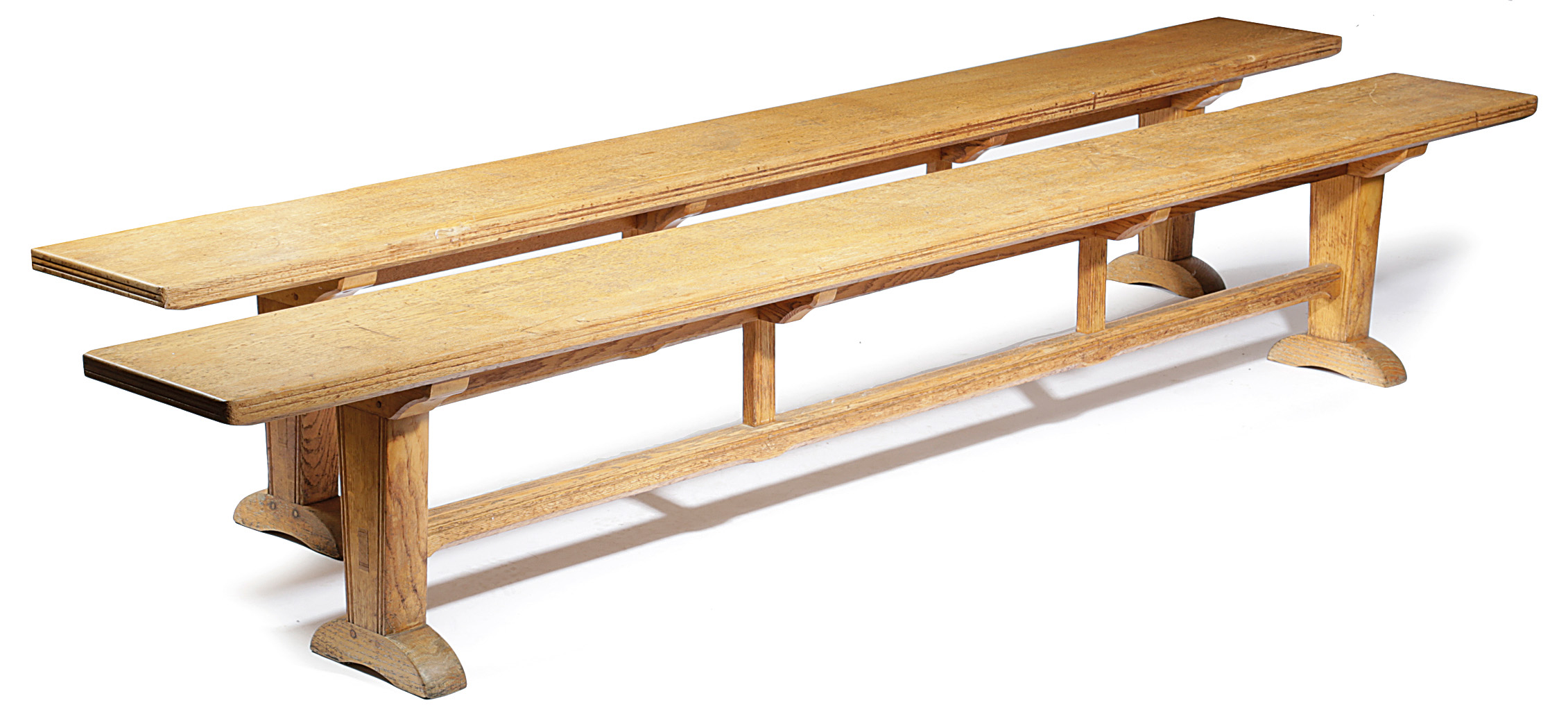 each with a rectangular seat, on trestle ends united by Gothic style chamfered stretchers (2)