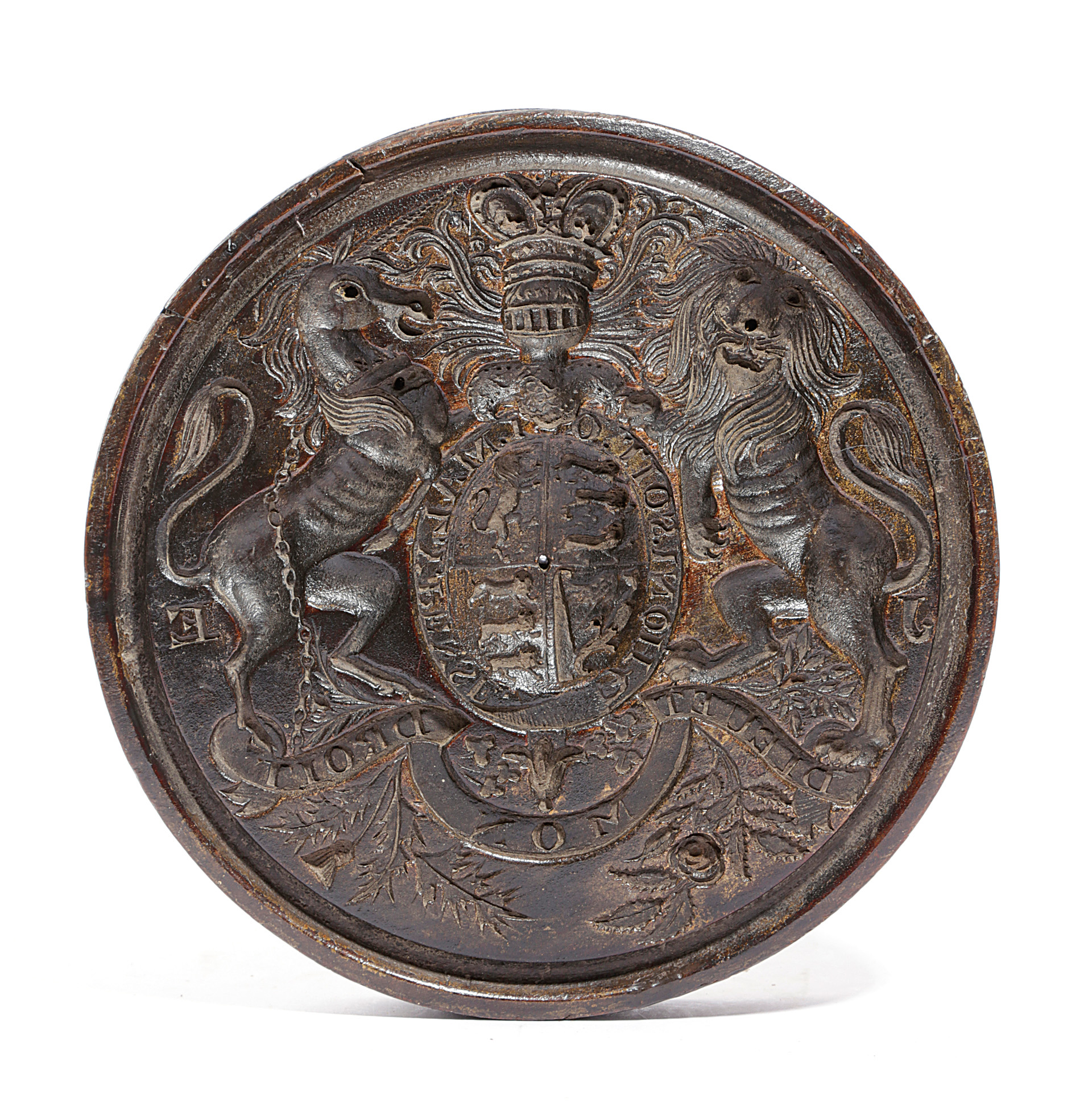 intaglio relief carved with the Royal Coat of Arms, the back with two iron suspension rings
