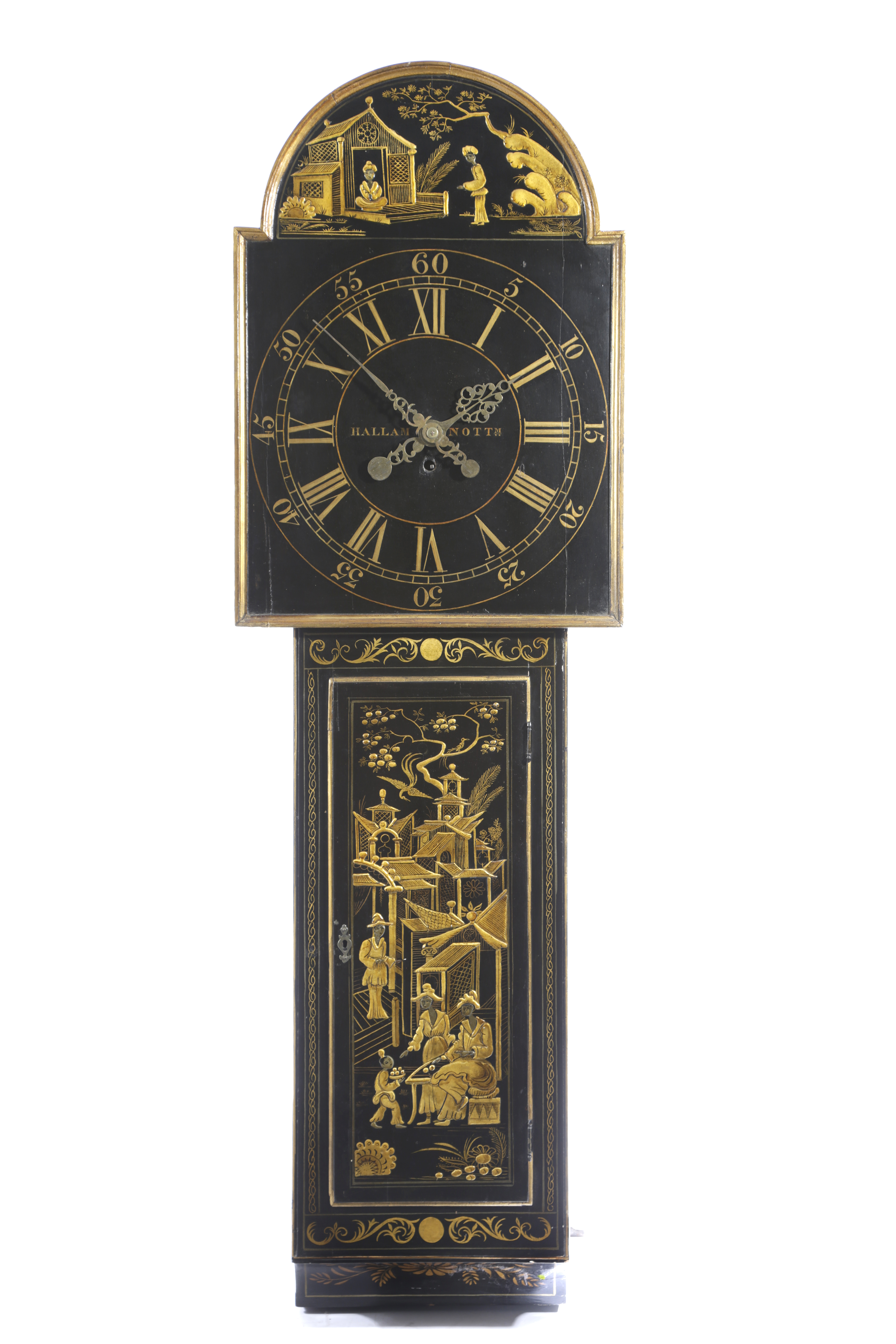 the brass eight day movement with four turned pillars and shaped plates, with an anchor escapement, the twenty inch square dial with Roman and Arabic numerals, with pierced brass scroll hands, the centre signed 'Hallam NottM', the restored case decorated in gilt with chinoiserie scenes of figures, buildings and trees