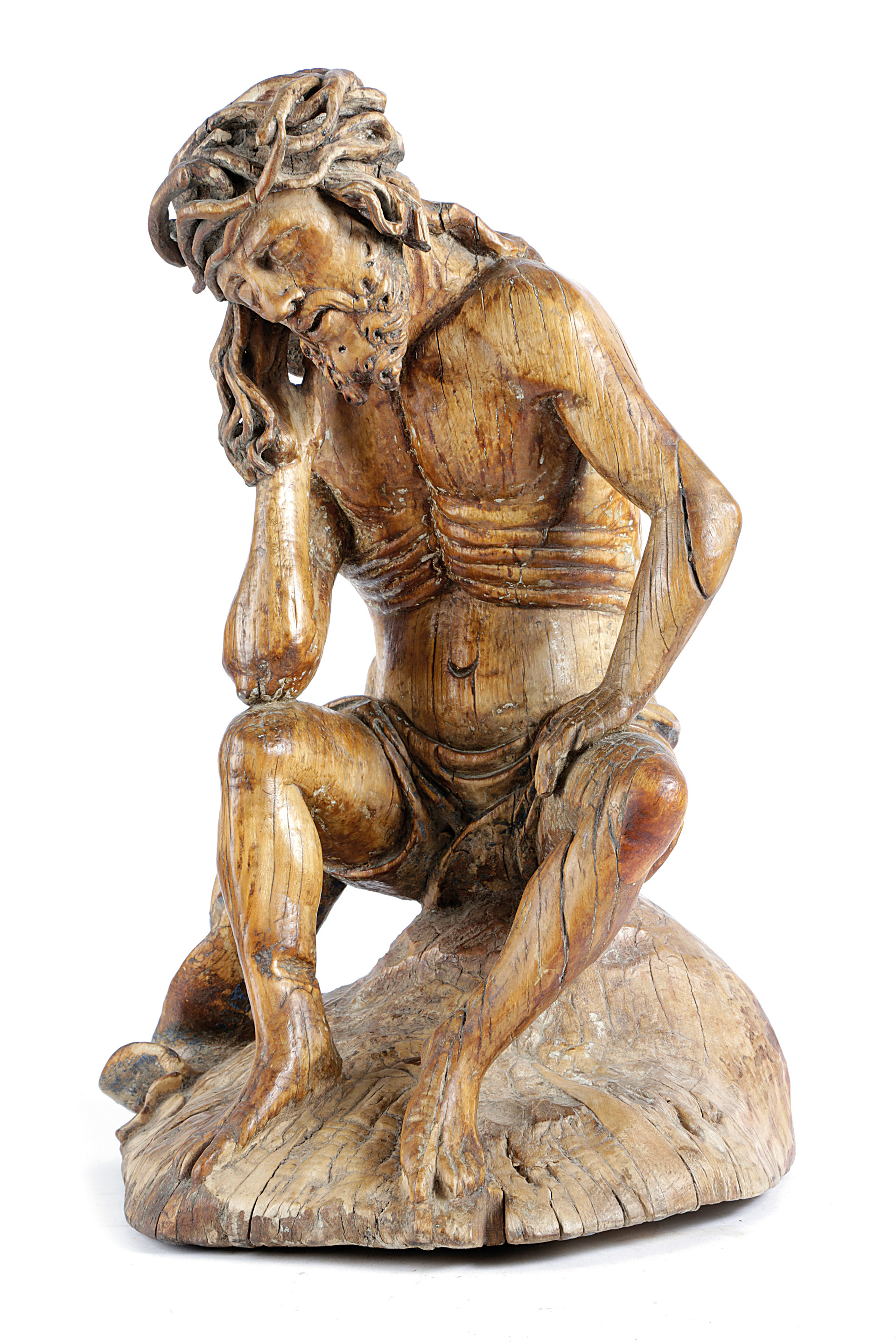 depicted seated wearing a crown of thorns, with a loin cloth partially covering his emaciated body, with traces of polychrome decoration