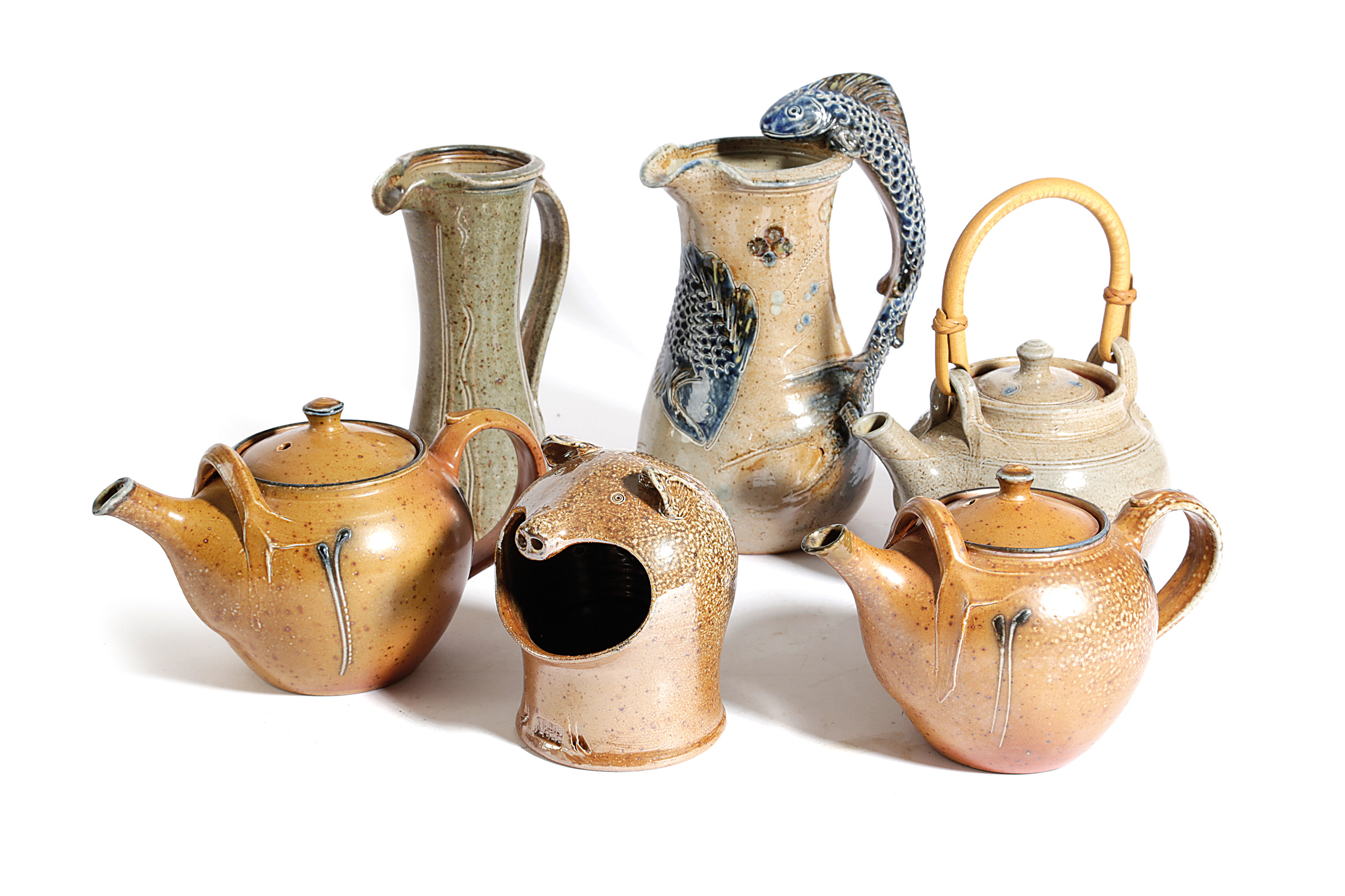 comprising: two jugs, one decorated with fish, three teapots and a model of a pig, with impressed and slip marks (6)