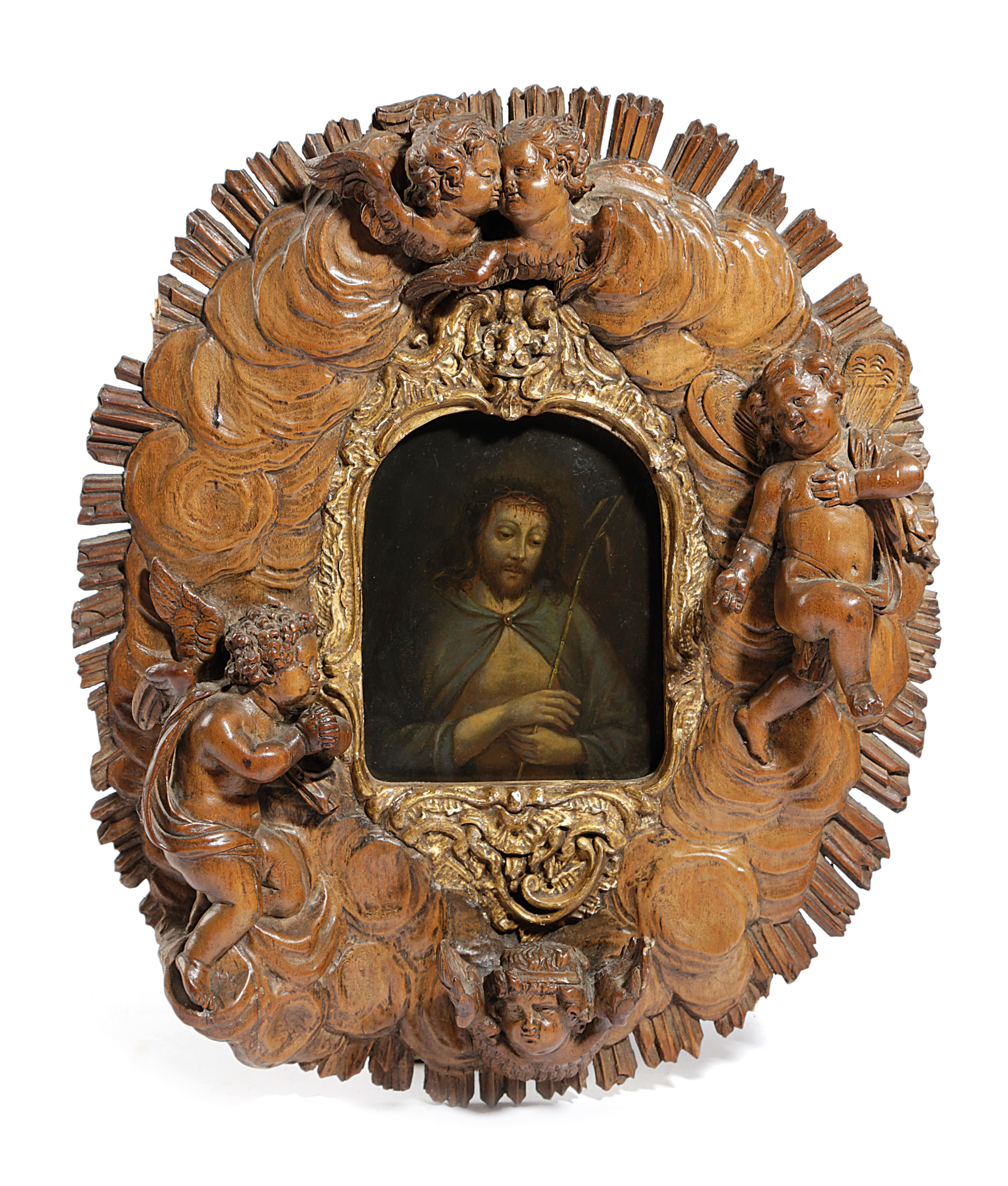 oil on copper, in a giltwood and llimewood frame, carved with cherubs and angels on a billowing cloud and sunburst ground
