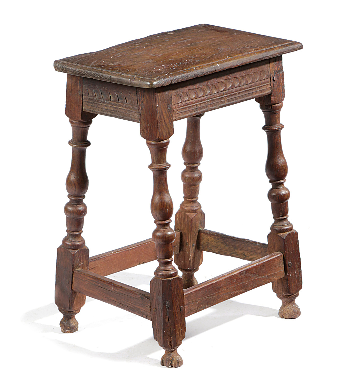 the rectangular seat with a moulded edge, the rails with thumbnail carved decoration, on baluster turned legs united by peripheral stretchers