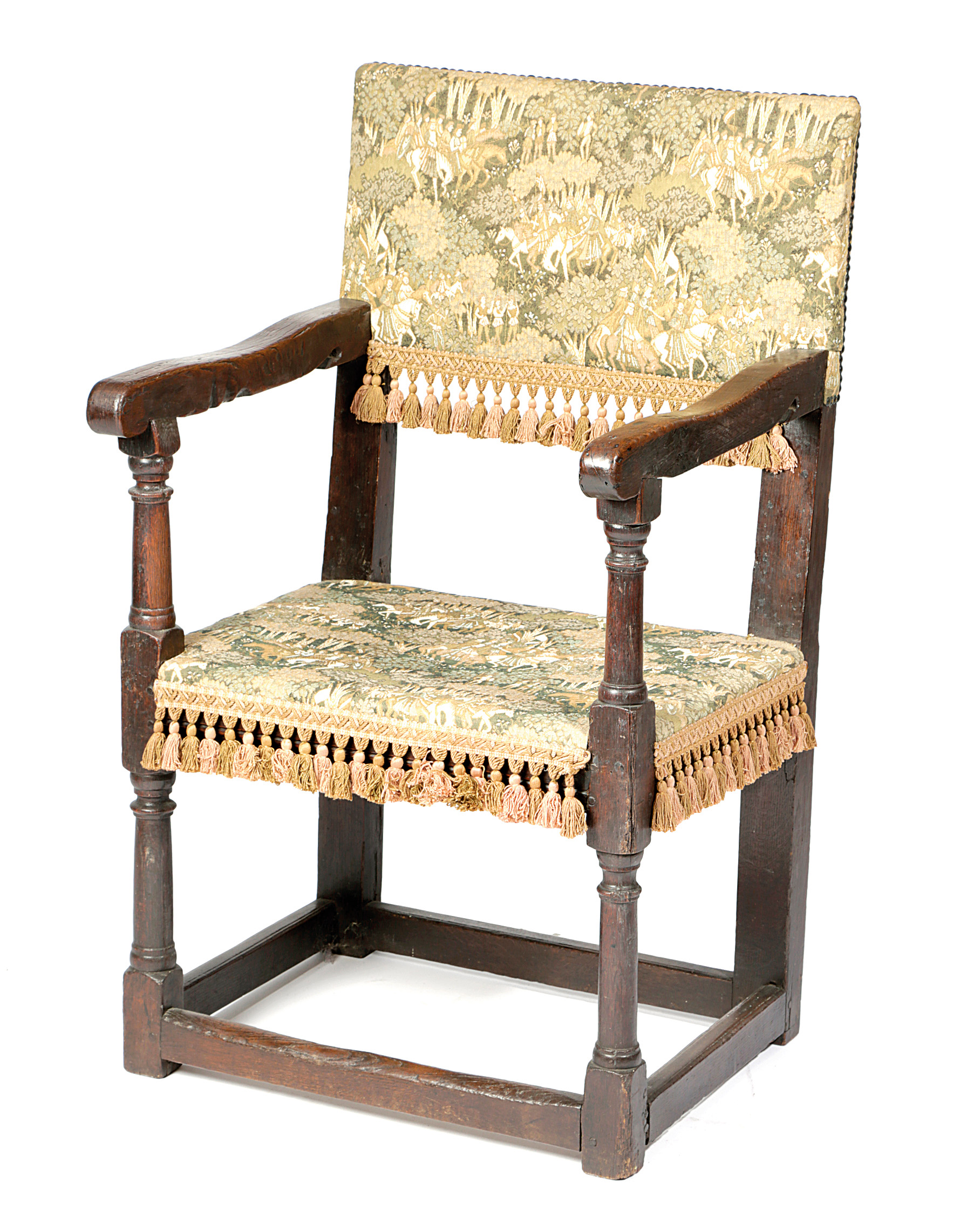 A CHARLES II OAK AND UPHOLSTERED ARMCHAIR