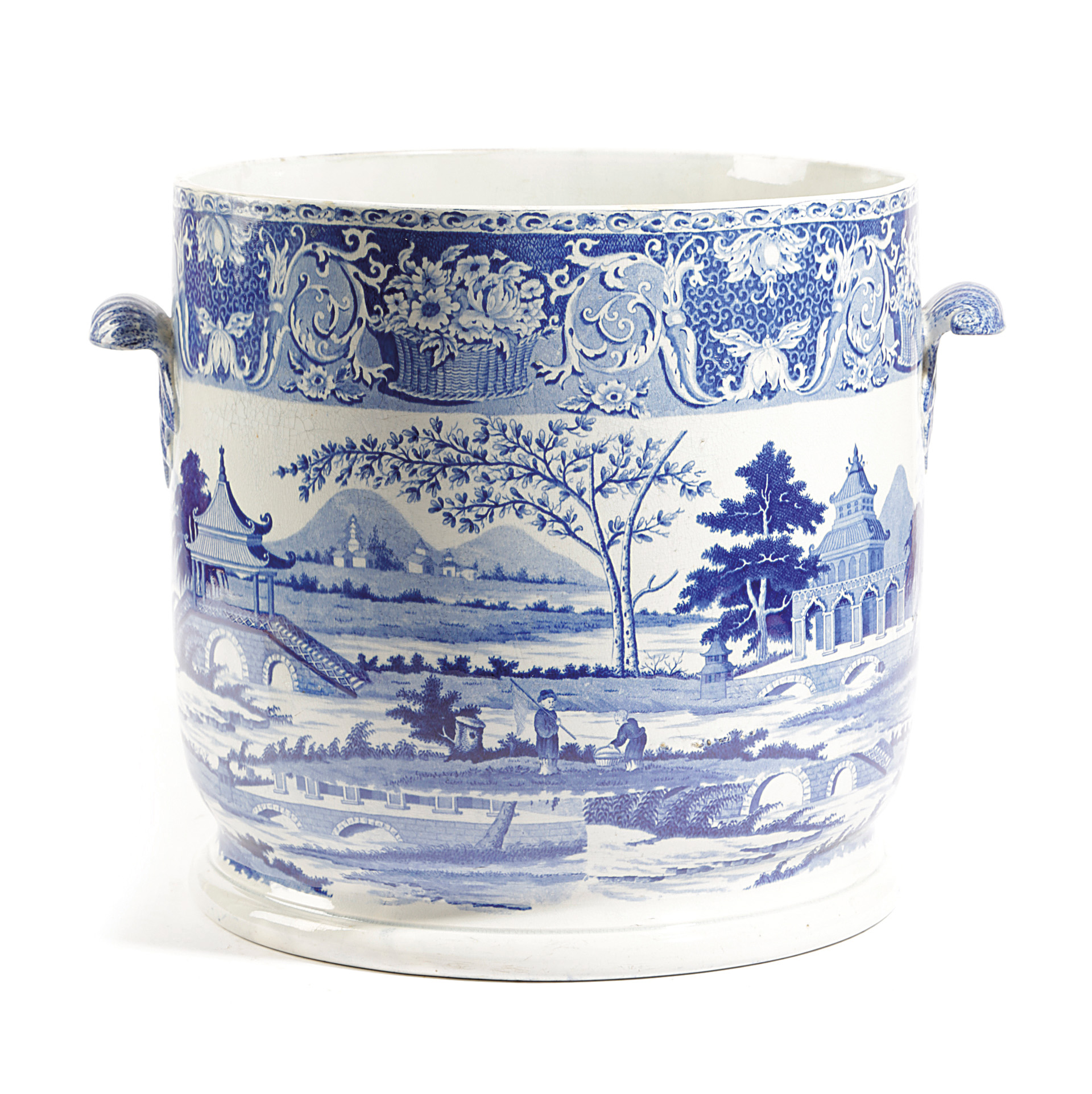 A LARGE PEARLWARE POTTERY BLUE AND WHITE CYLINDRICAL JARDINIERE