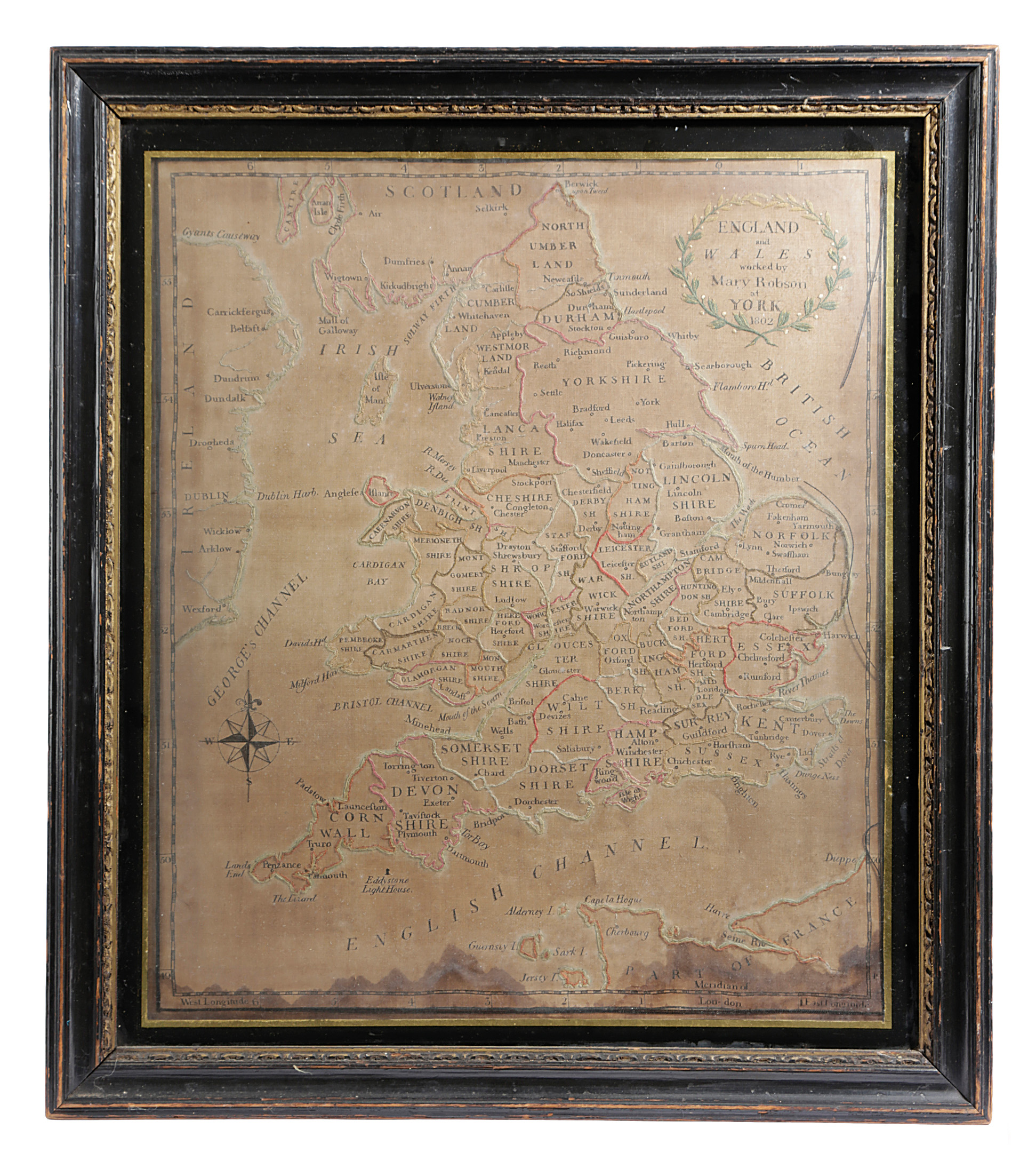 depicting England and Wales, the counties and place names worked in monochrome satin stitch, with the regions outlined in polychrome crewel yarn, on a linen ground, signed and dated 'Mary Robson 1802 York', in a verre eglomise Hogarth type frame