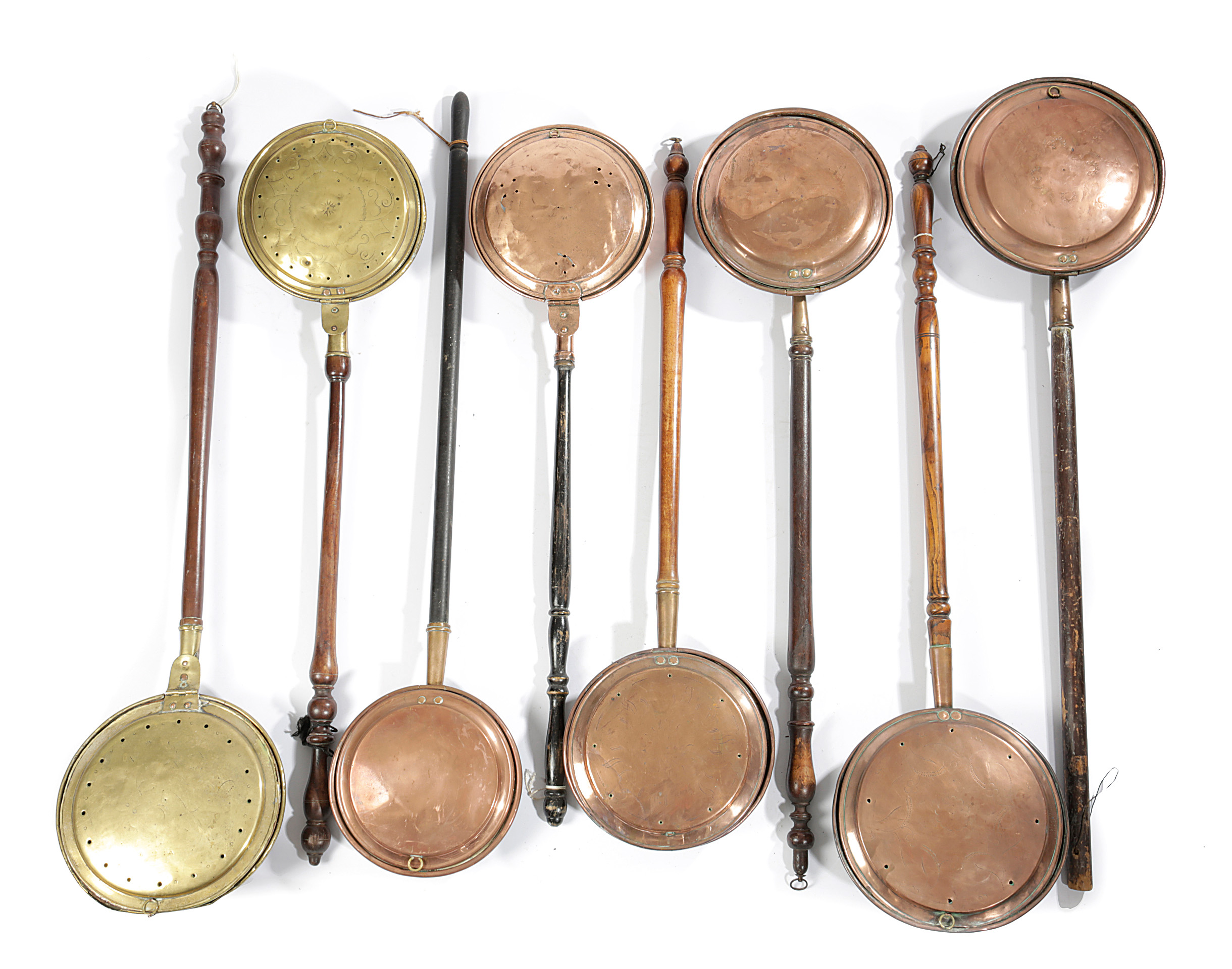 EIGHT ASSORTED COPPER AND BRASS WARMING PANS