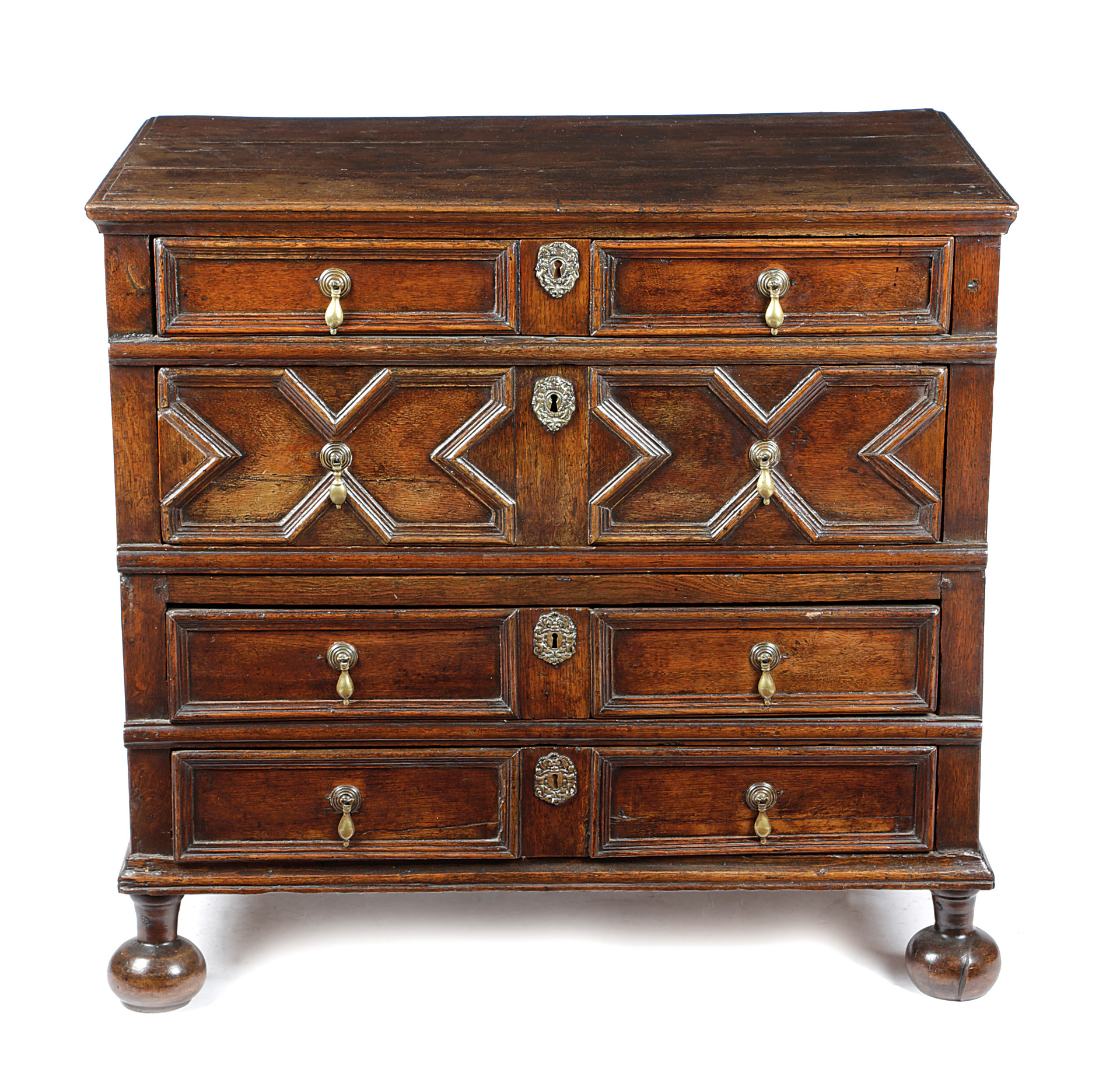 in two halves, with four long geometric panelled drawers, on later bun feet
