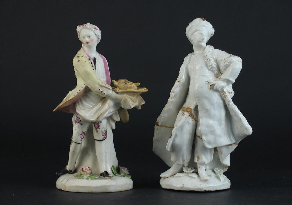 Two Bow porcelain figures, one of a cook carrying a plate, the other of a Turk left uncoloured. Extensive damage. Both c.1755-60, 18cm. (2)