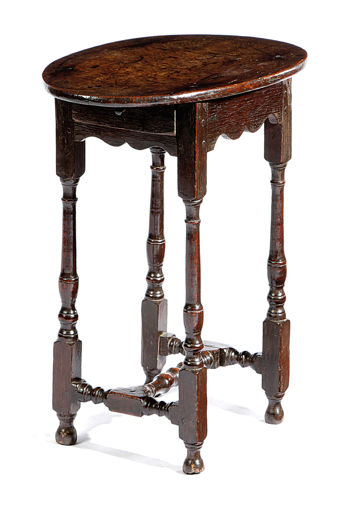 the oval top above an end frieze drawer, on slender baluster turned legs united by a turned 'H' stretcher