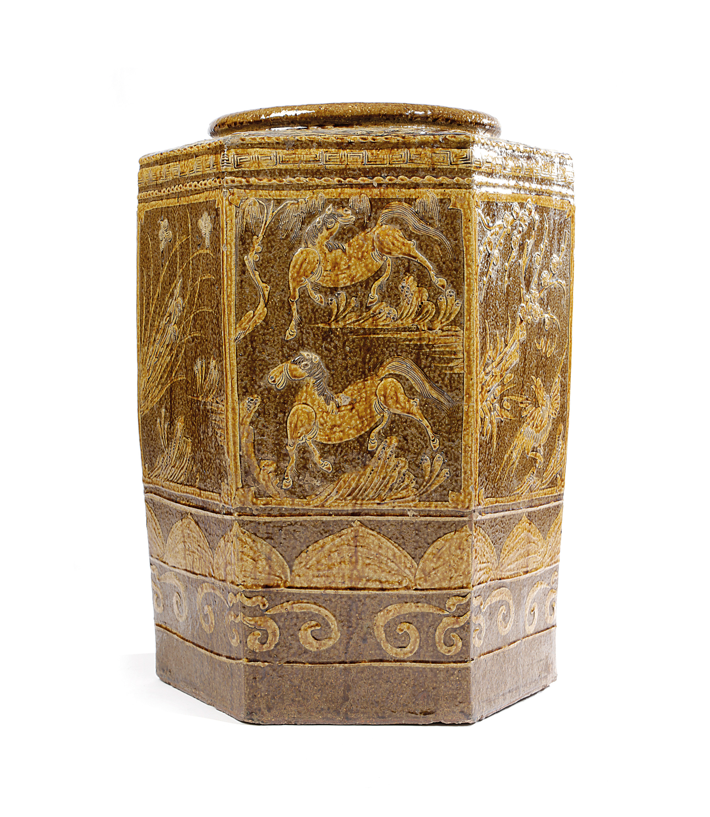 of hexagonal form, decorated with panels of horses, birds, leaves and butterflies