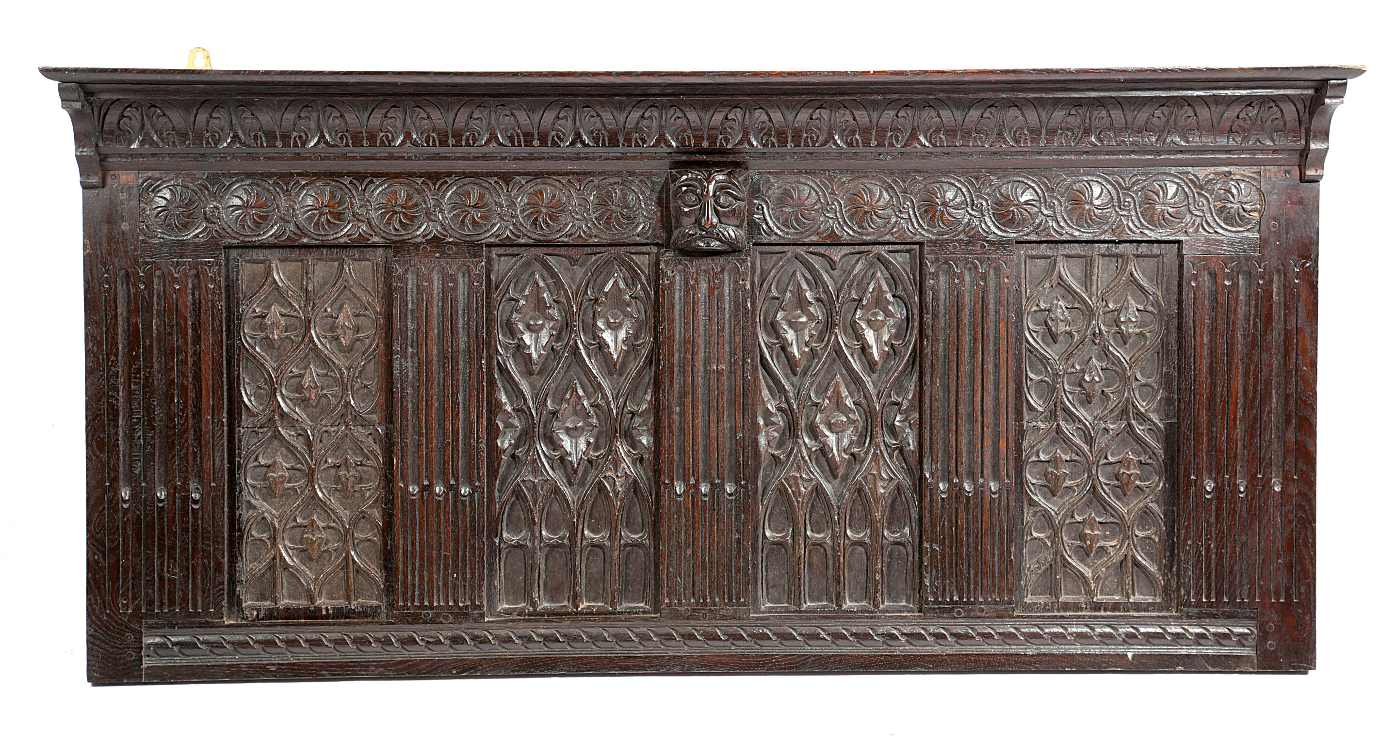 inset with two pairs of Gothic panels, with lancet arches and sinuous tracery, flanked by stop fluted pilasters, with a whorl carved frieze, centred with a lion's mask