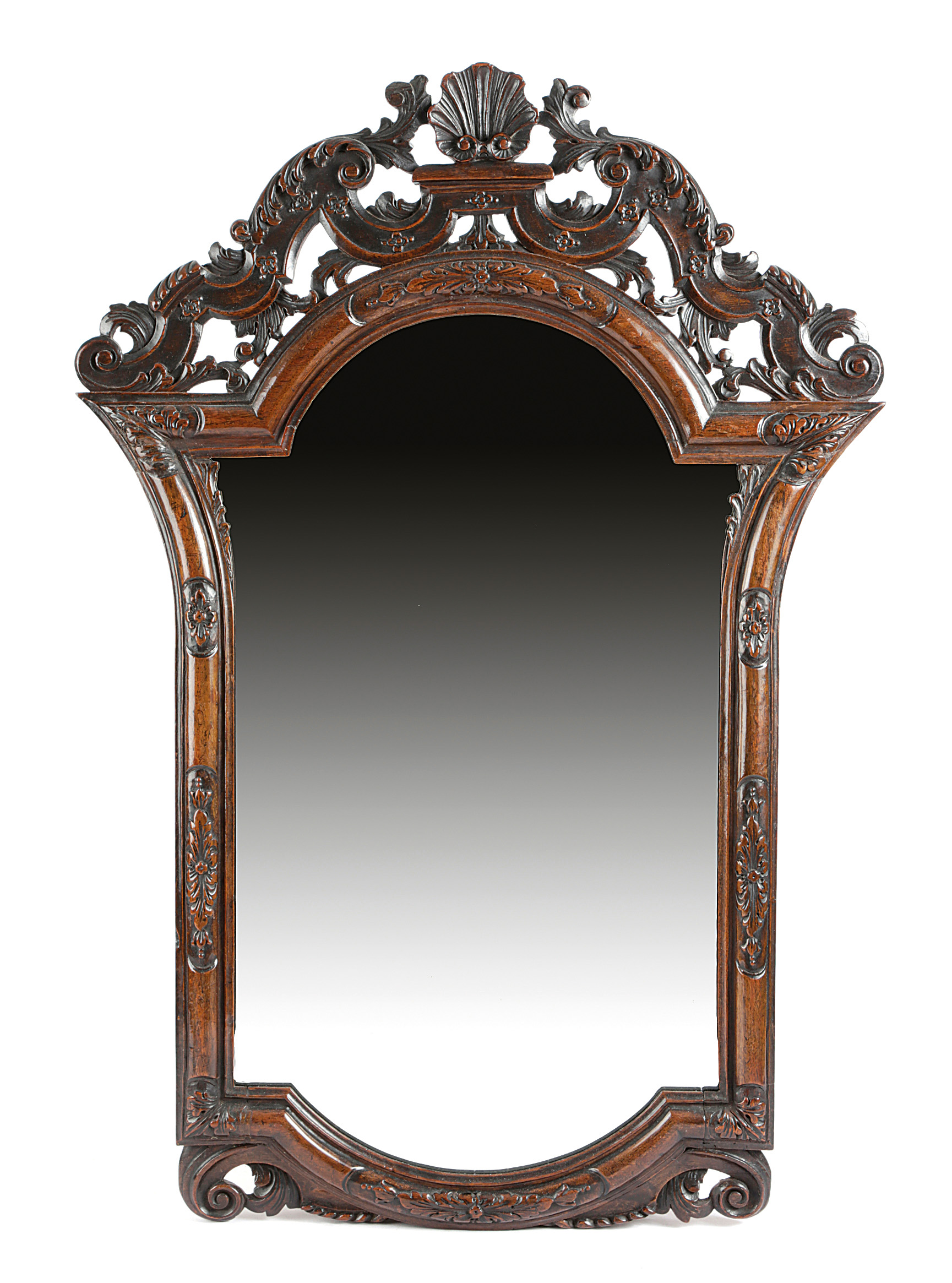 the later shaped plate within a floret carved moulded frame, the scroll and leaf surmount centred with a shell