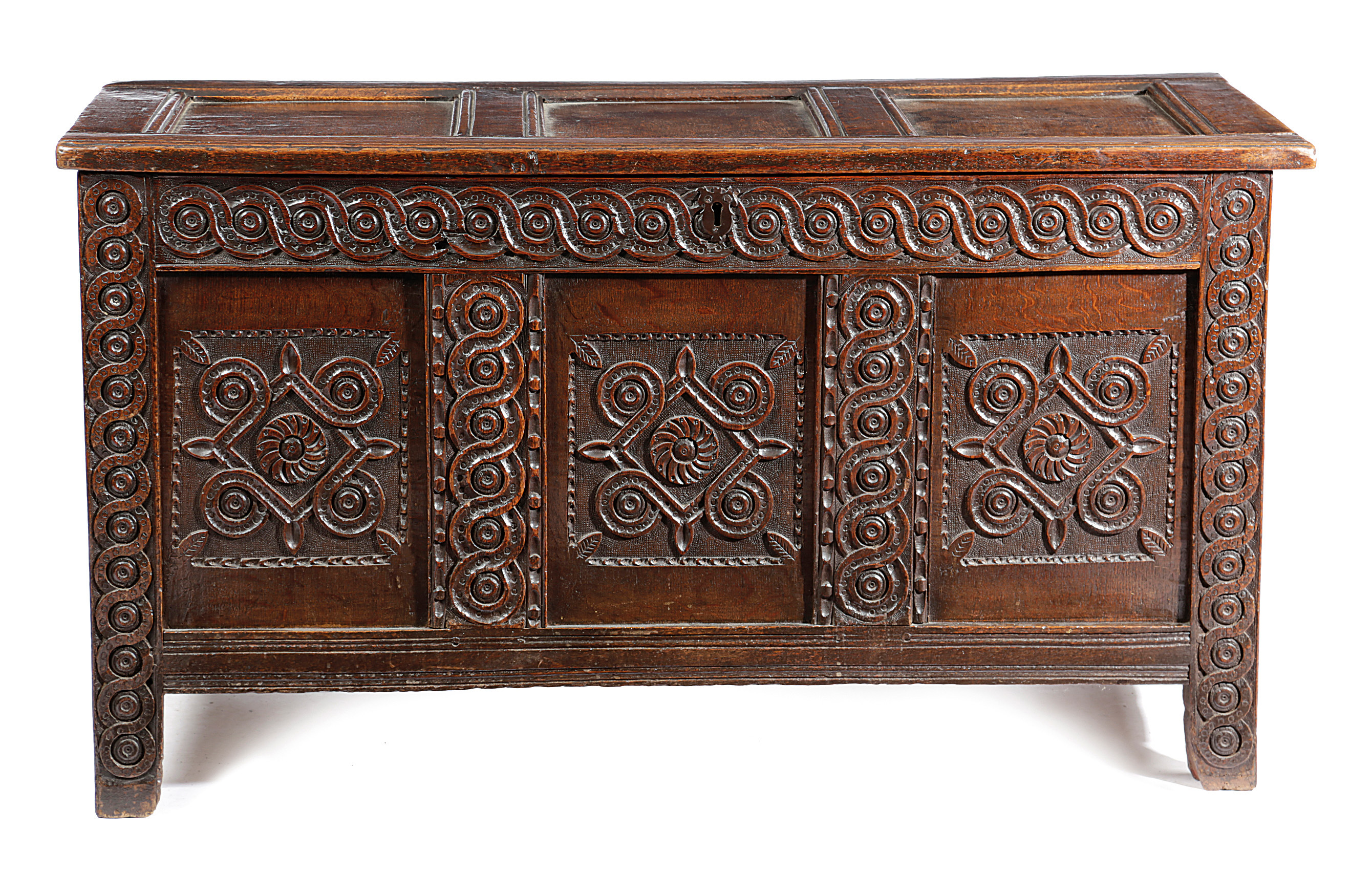 the triple panelled top with later hinges revealing a vacant interior, the front carved with guilloche bands and three panels of scrolls and a central flowerhead