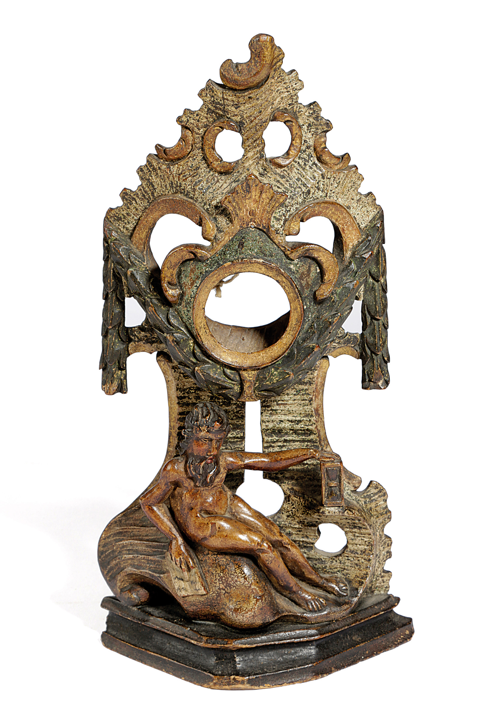 AN 18TH CENTURY POLYCHROME LIMEWOOD AND PINE WATCH HOLDER