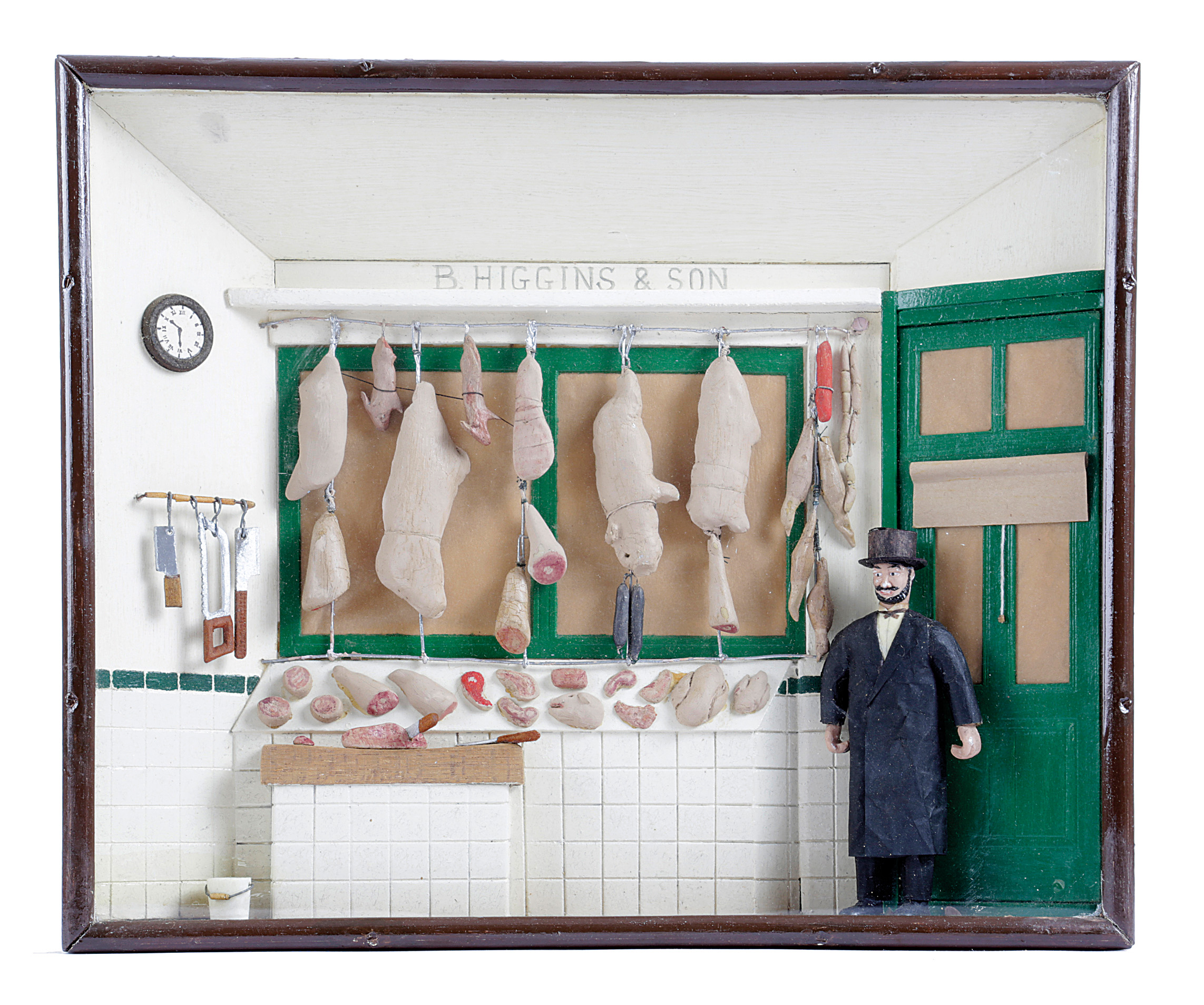 'B. Higgins & Son', with a bearded butcher wearing an overcoat and a top hat, with various cuts of meat in a tiled interior with a wall clock, knives and saws, in a glazed and painted box case