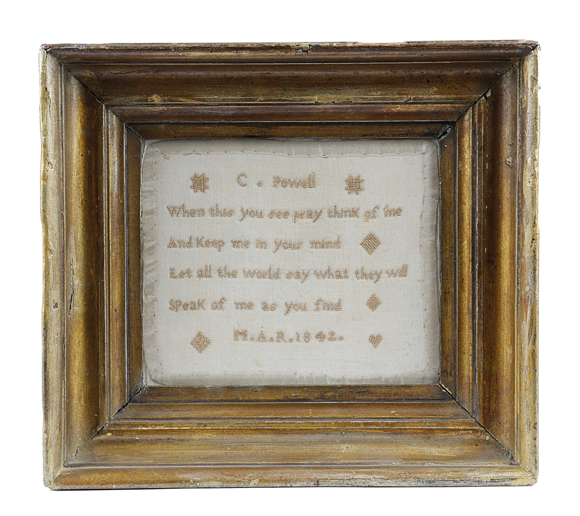 worked with monochrome gold silk floss in cross stitch on a fine linen ground, with a verse and inscribed 'C. Powell', with star, diamond and heart motifs, signed and dated 'M.A.R. 1842', in a glazed giltwood frame