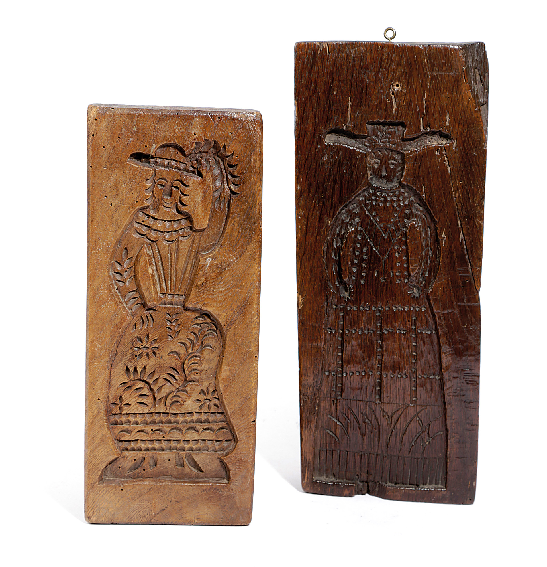 one in elm, the other in chestnut, double-sided, carved with figures wearing hats (2)