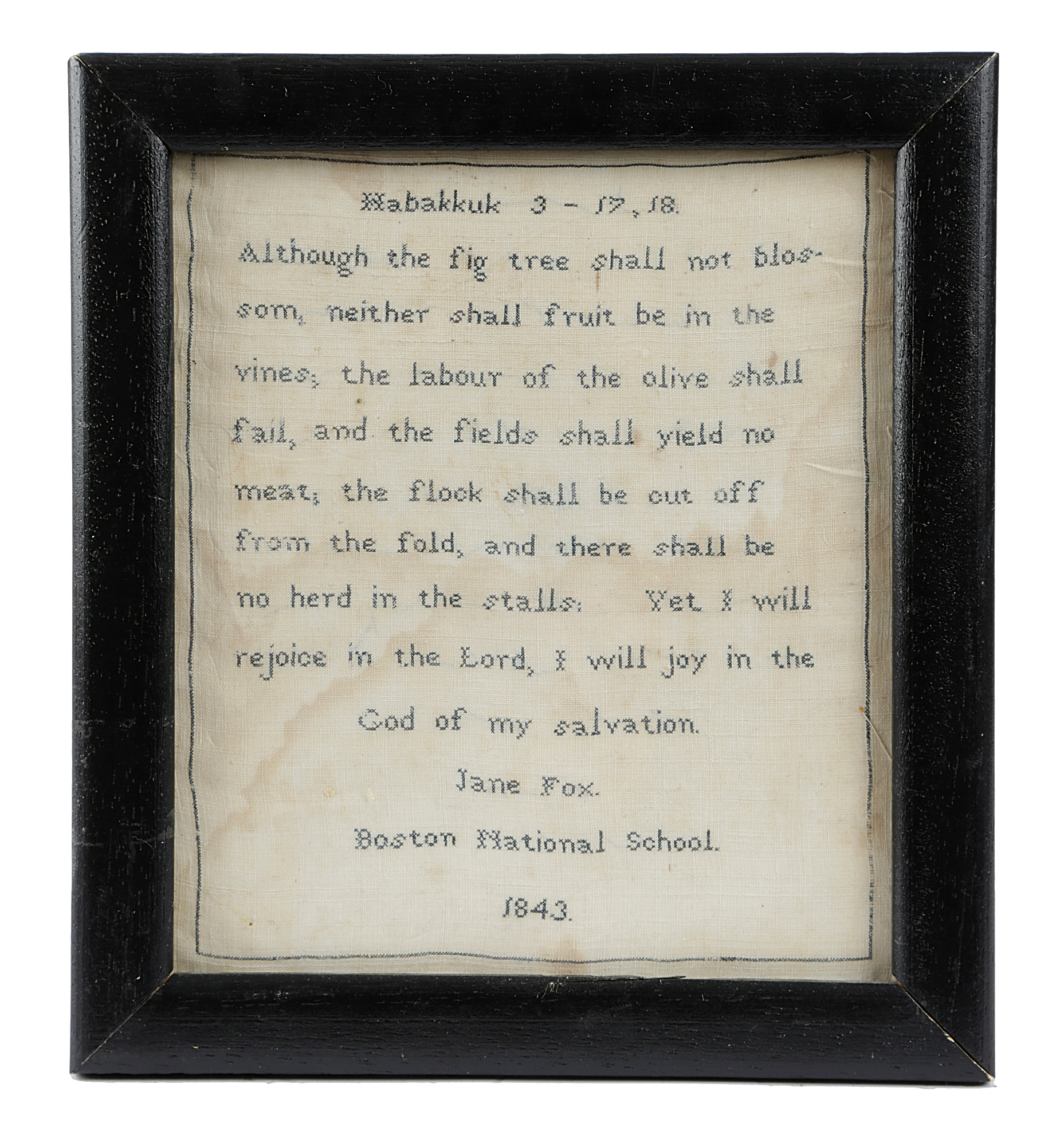 containing: an alphabet sampler worked with polychrome cotton thread in cross stitch on a canvas ground, with capital and lower case alphabets and numbers, inscribed at the bottom 'Ellen Constable. Aged 9 yrs. St Andrew's Nat. Sch. 1873.', the back with a handwritten label 'Executed by a descendant of John Constable the painter. Purchased from the Constable family.', a small monochrome example worked with cross stitch, titled 'Habakkuk 3 - 17, 18.' above a verse, inscribed at the bottom 'Jane Fox. Boston National School. 1843.', the reverse inscribed in pen 'Lincolnshire Boston', a monochrome example worked with blue silk on canvas ground, with an upper and lower case alphabet and numbers, above the inscription 'Emily Burbridge. Born the 17th of May 1874. St Paul's Girls School. Park Lane. Tottenham.' and 'Worked for the Government Examination. 1885.', and a monochrome example worked with black thread on canvas, inscribed 'Declaration of the Keywood Youth's Temperance Society We whose names are hereunto subscribed do voluntarily agree to abstain from all intoxicating liquors except used as medicine or in a religious ordinance Esther Livsey Aug 21 1835 ...', all in glazed ebonised frames (4)