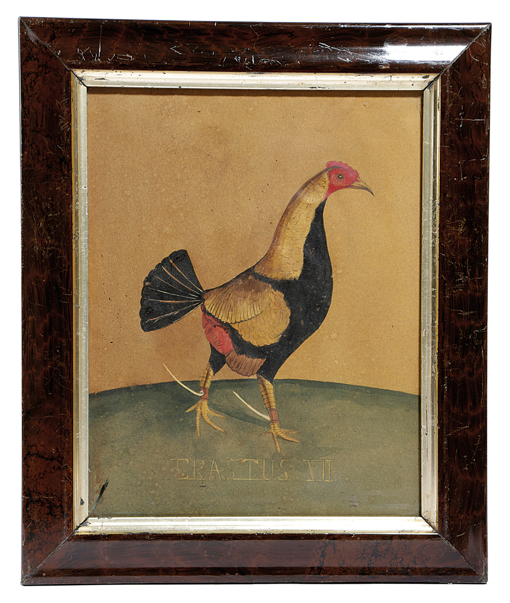 each bird wearing gilt spurs, titled, 'Erastus VII' and Olworth XI', in glazed simulated moulded frames (2)