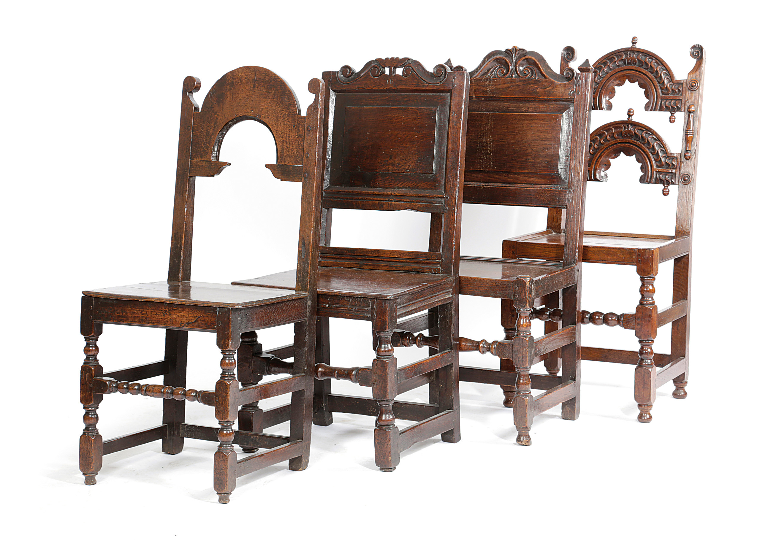 comprising: a 'Yorkshire' type chair with an arched back and applied split mouldings, a similar chair with a plain arched back and two similar backstools each with a fielded back with a scroll carved top rail, one branded with initials 'ID' (4)