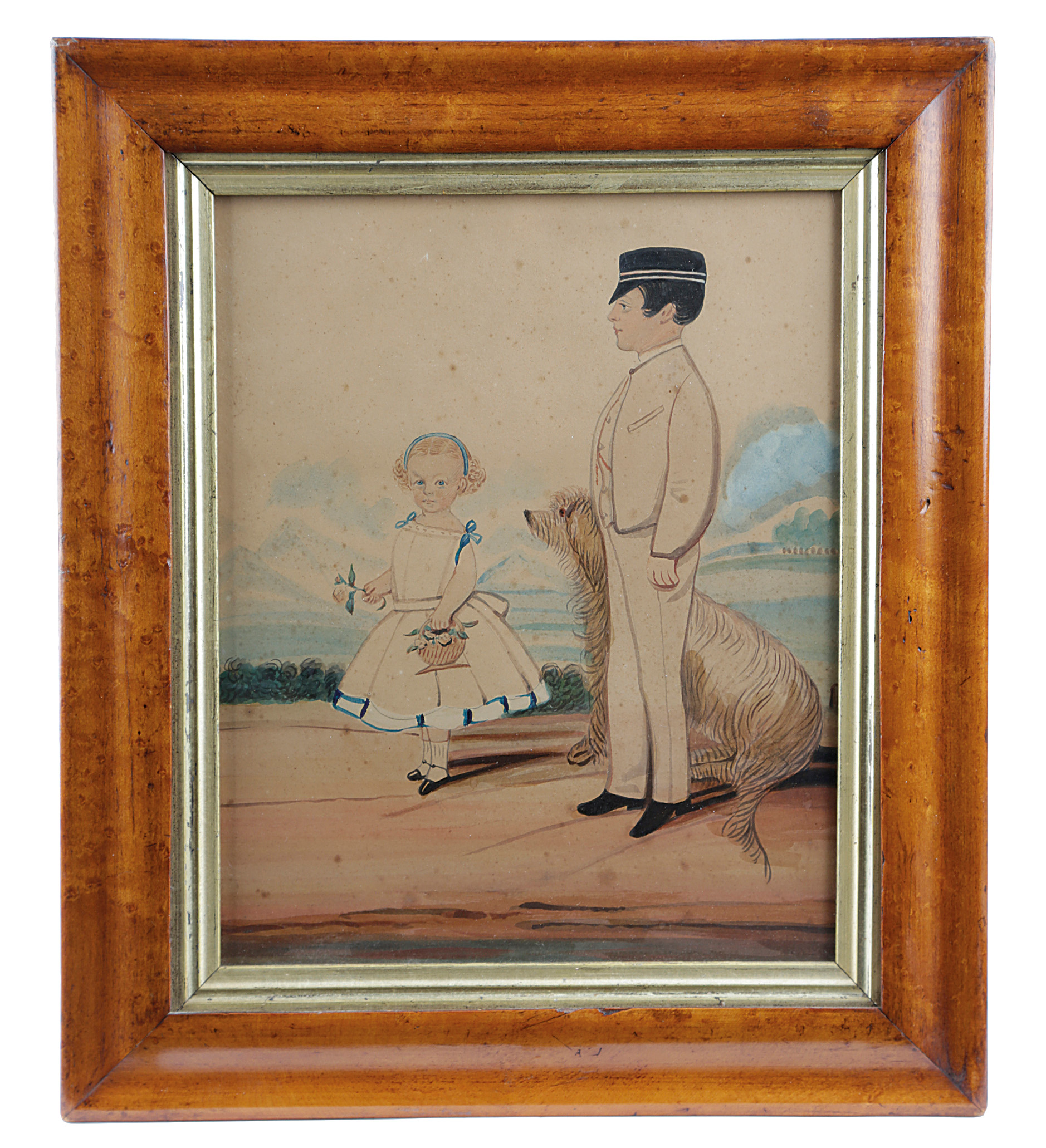 depicting a boy sporting a black together with a young girl with a basket of roses, accompanied by their old English sheep dog, in a glazed bird's eye maple frame