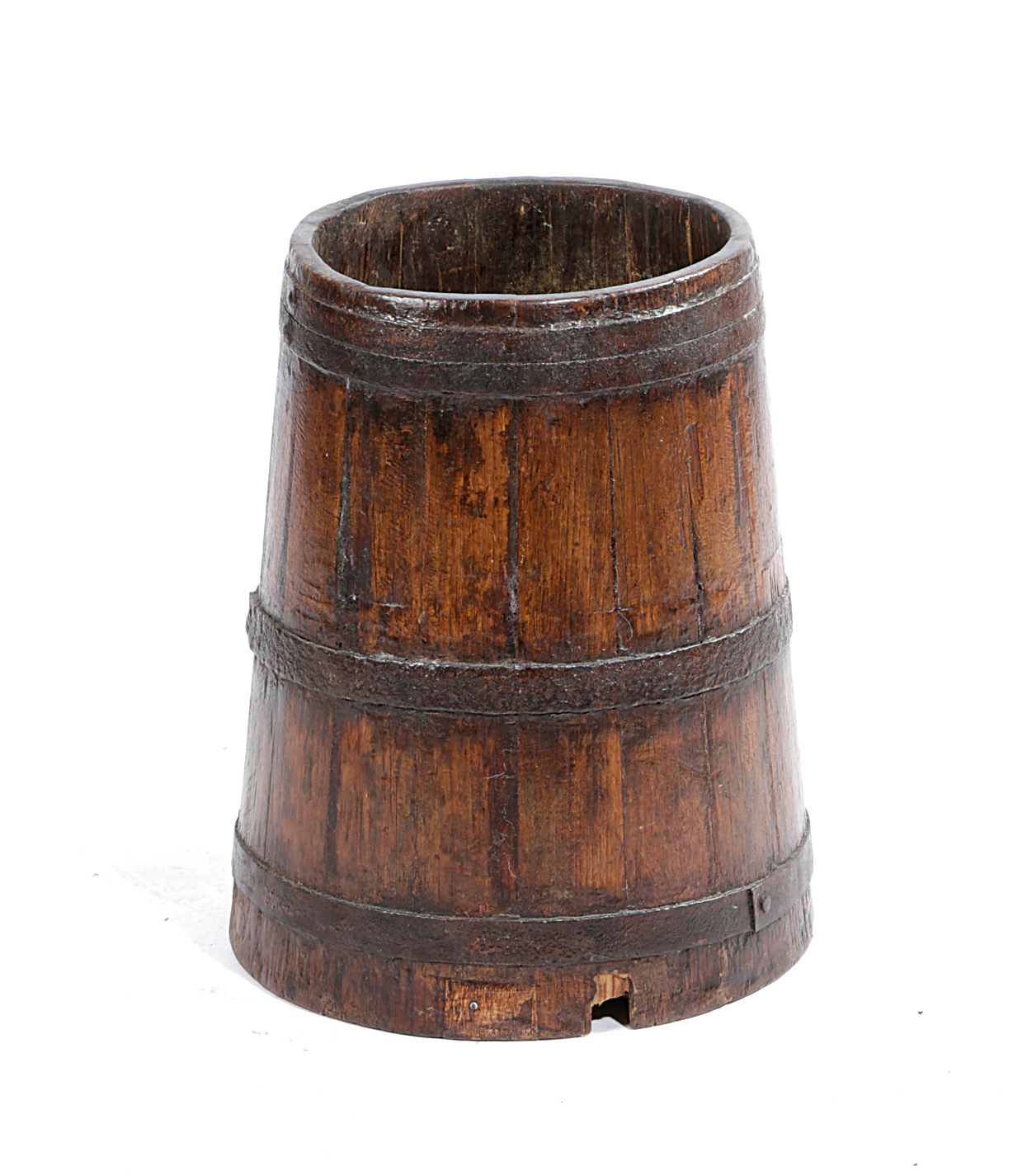 A COPPERED OAK AND IRON BOUND CHURN STICKSTAND