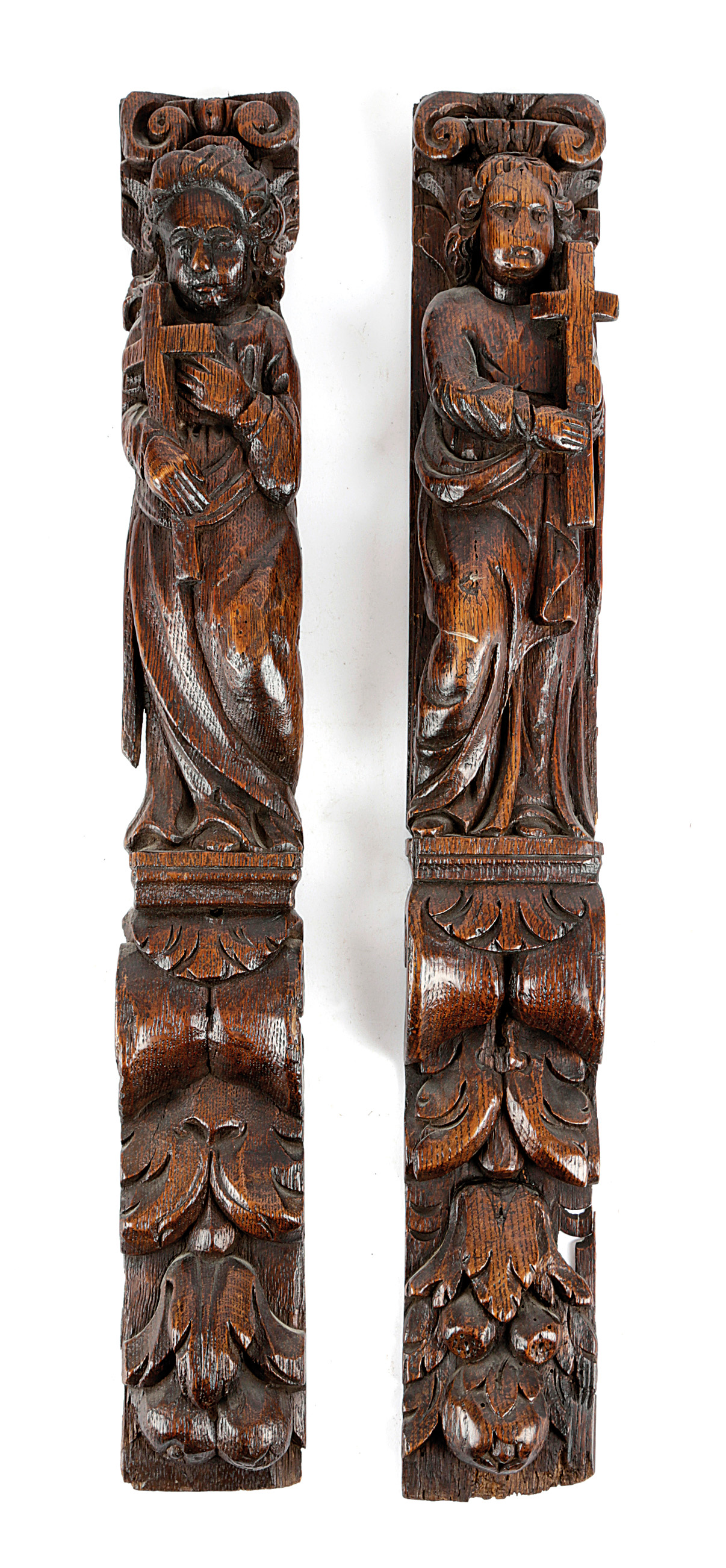 each carved with a saint figure holding a cross, above leaves and fruit (2)