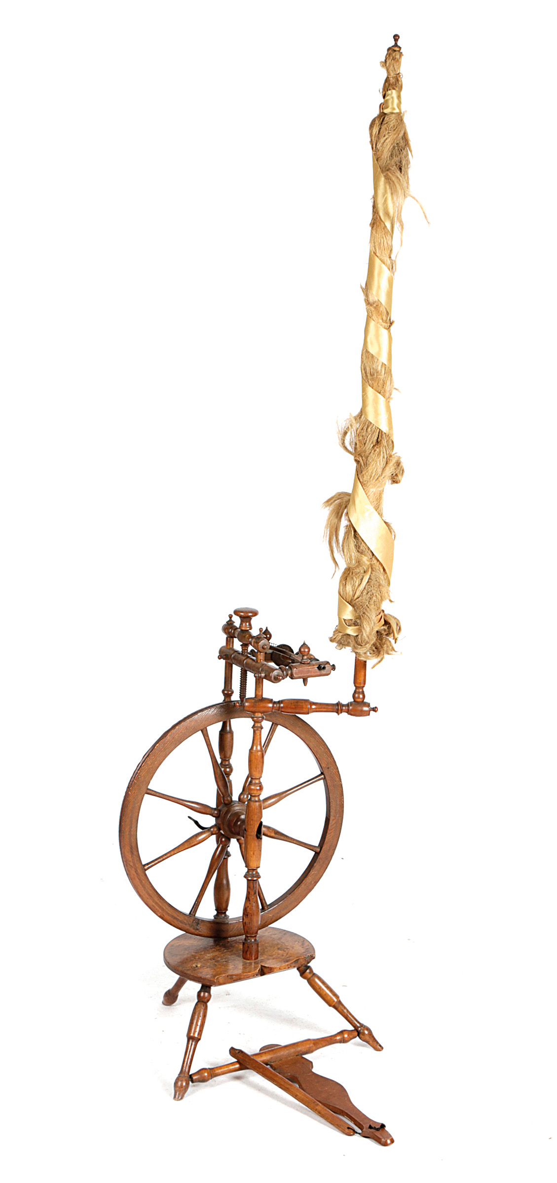 A TURNED FRUITWOOD AND PINE SPINNING WHEEL