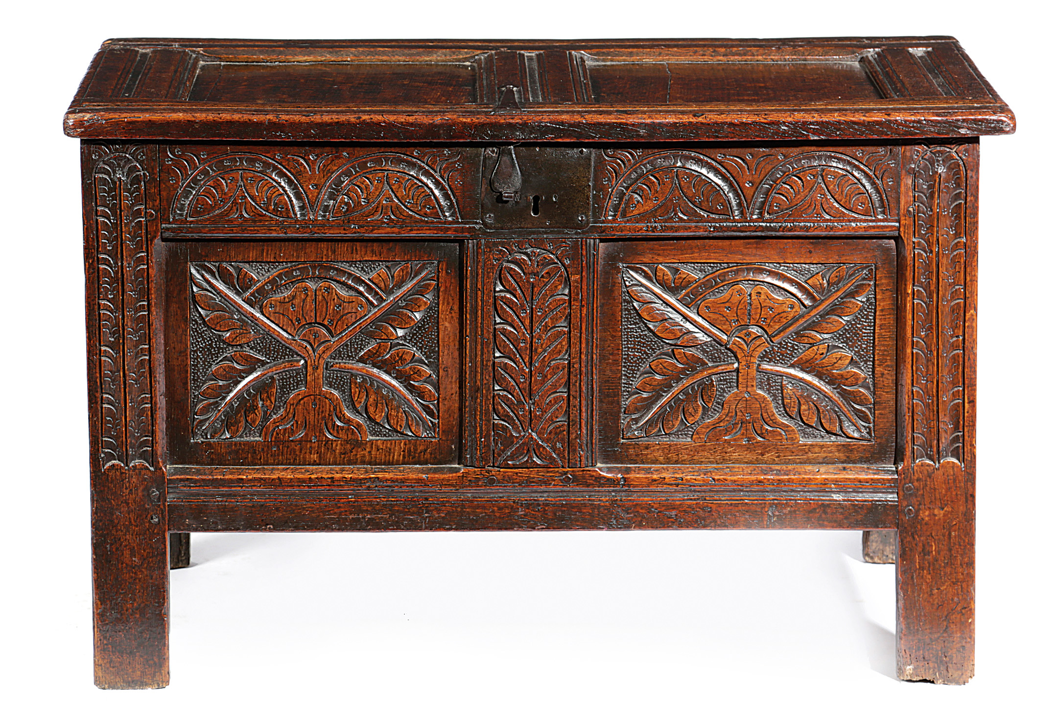 A CHARLES II OAK TWIN-PANELLED COFFER