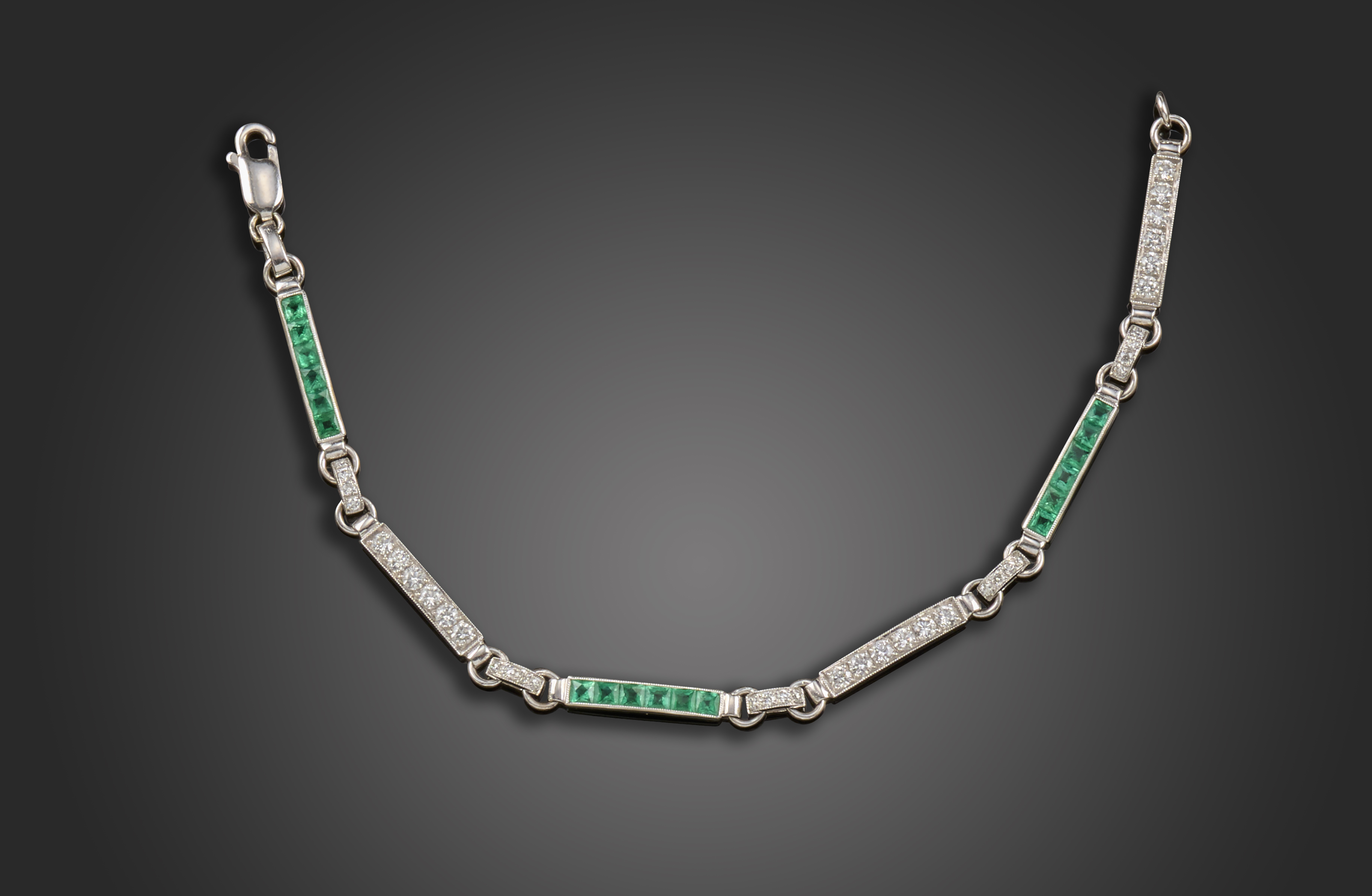 An emerald and diamond bracelet, the slightly curved white gold panels alternately set with a line of round brilliant-cut diamonds and calibre-cut emeralds,19cm