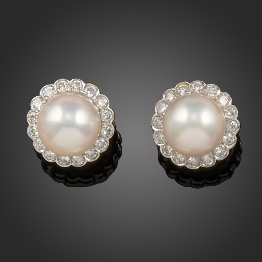 A pair of cultured pearl and diamond cluster earrings, the cultured pearls set within a surround of round brilliant-cut diamonds in white gold, post fittings, 1.3cm wide