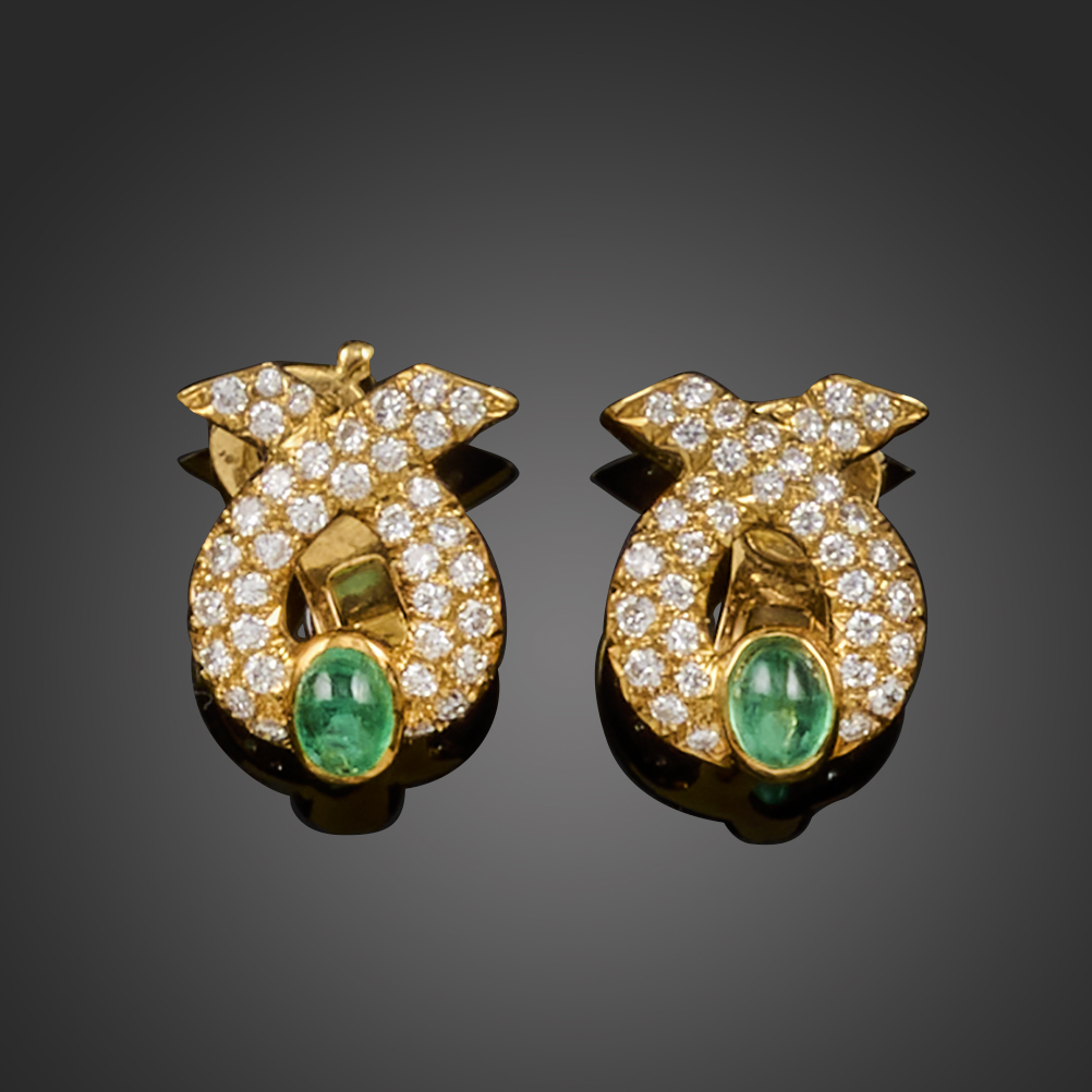 A pair of French emerald and diamond earrings by Fred, pavé-set with brilliant-cut diamonds and a cabochon emerald at the base, signed 'FRED' to the reverse, '750' and French control marks, 1.6cm long, maker's fitted case