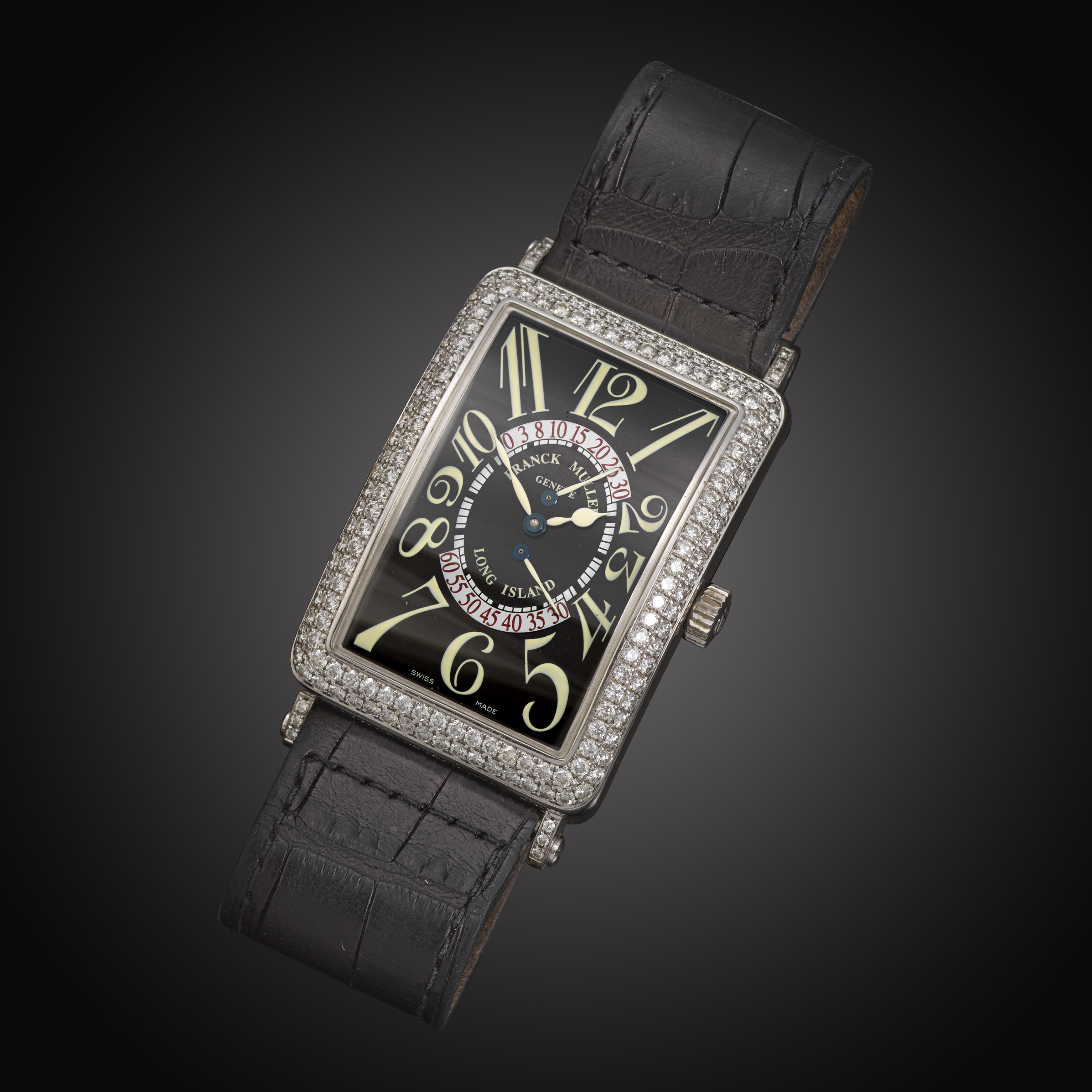 A gentleman's diamond-set 18ct white gold 'Long Island' wristwatch by Franck Muller, the signed black enamel dial with cream Arabic numerals, two retrograde displays for continuous seconds with red Arabic numerals, case and lugs set with round brilliant-cut diamonds, caseback signed, ref 1100 DS R D 'COLOR DREAMS'. No. 34 and inscribed 'Master of Complications', case 32mm, automatic movement signed and numbered 2892A2, signed black leather strap 22cm long, diamond-set white gold buckle with maker's mark 'FM', 23cm long, box and papers