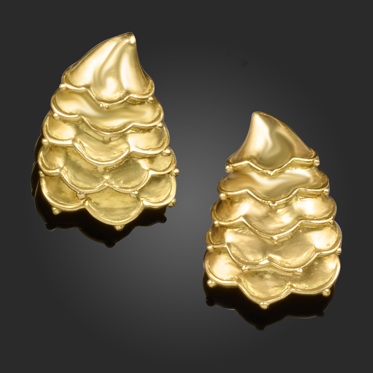A pair of gold earrings by Angela Cummings, designed as fir cones, with pellet decoration in gold, signed Cummings, 1989 and stamped 18K, post and clip fittings, 2.8cm high, 22.5g