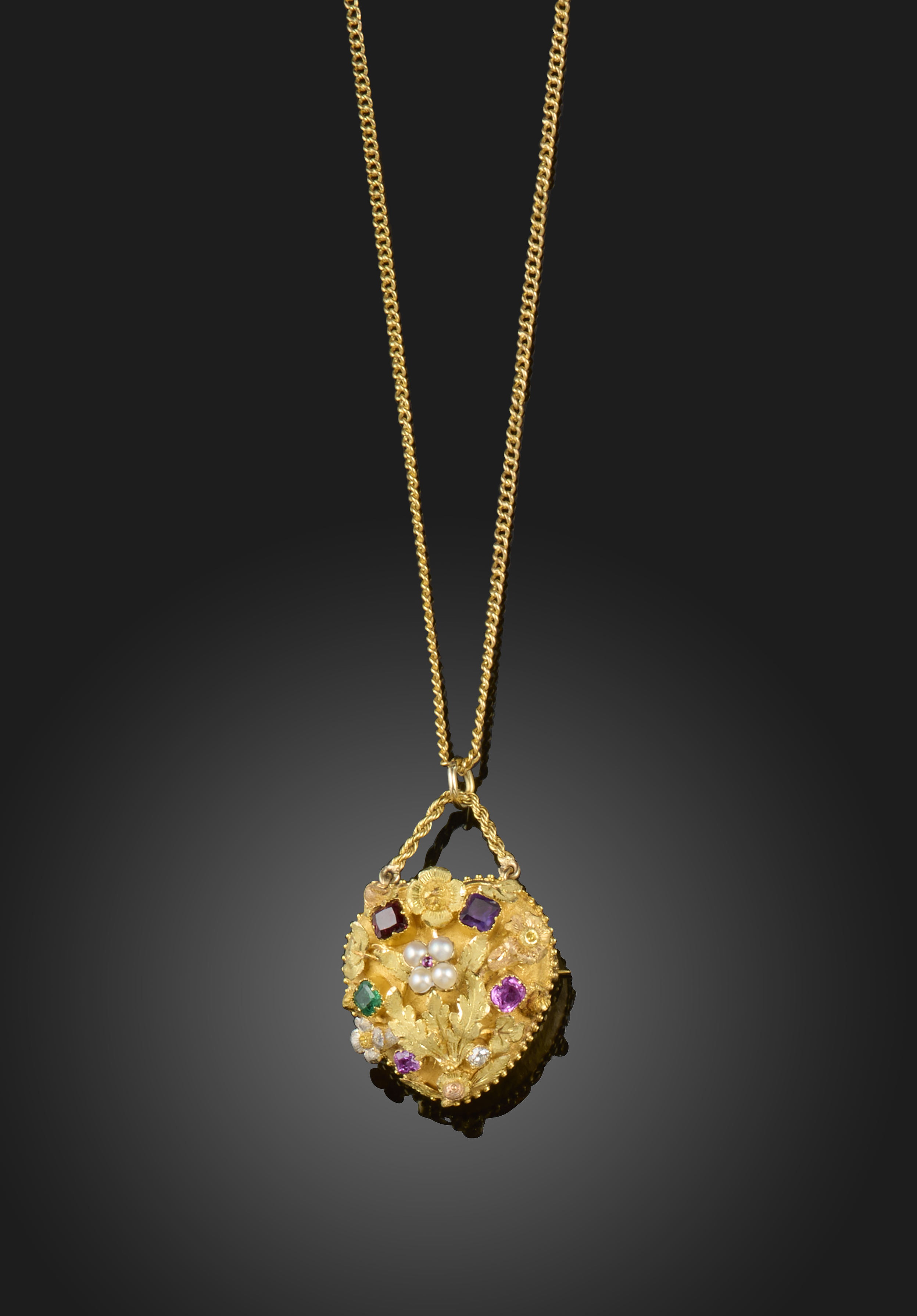 A Regency gem-set gold acrostic brooch pendant, the heart-shaped brooch pendant set with a ruby, emerald, garnet, amethyst, ruby and diamond spelling 'REGARD', with further seed pearls and foliate decoration in three-colour gold, glazed locket compartment to the reverse containing hair, 2.8cm high, on a fine-link gold neck chain, 22cm long, case by Harvey & Gore