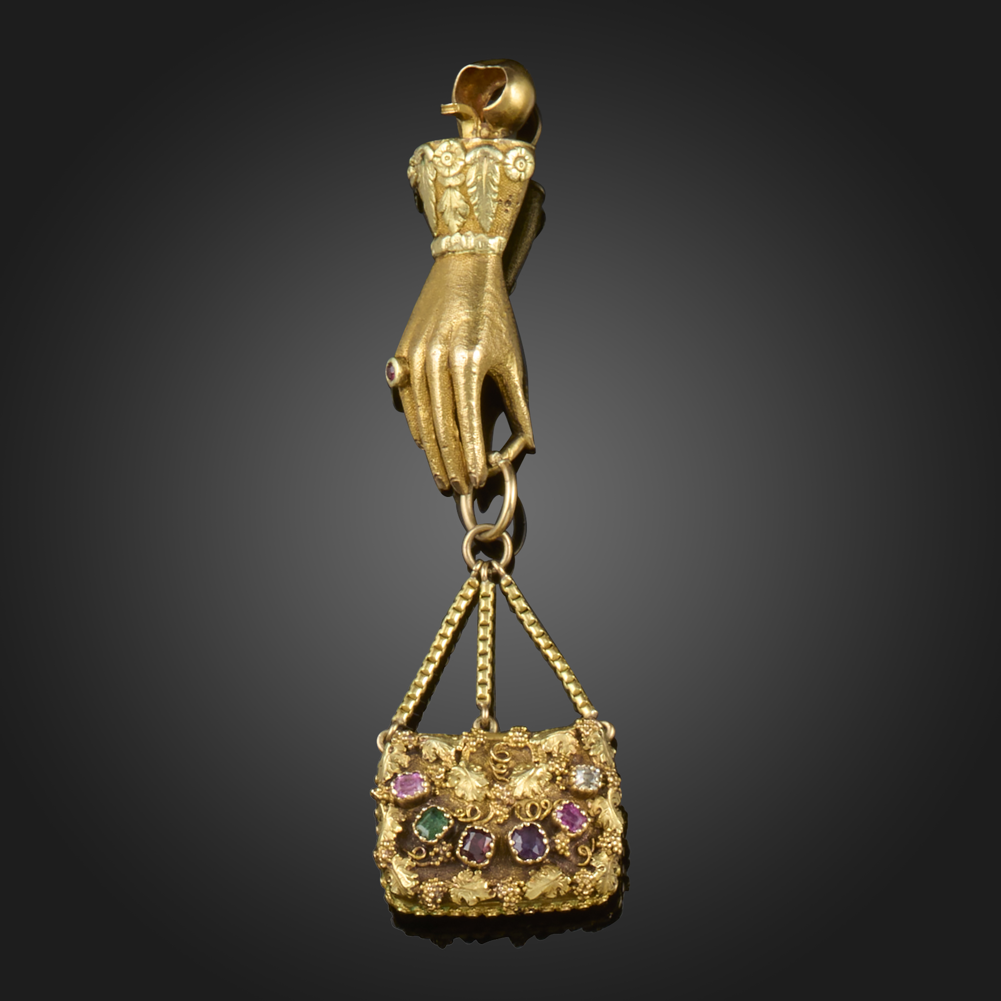 A Regency gem-set gold acrostic bag-form locket pendant, set with a ruby, emerald, garnet, amethyst, ruby and diamond spelling 'REGARD' with heavy foliate scroll decoration on matted ground and clusters of flat pellets to the reverse, opening to reveal a glazed locket compartment, suspended on three fine link gold chains from a George III hand-form clasp with red stone ring and foliate decorated cuff, locket 2cm wide