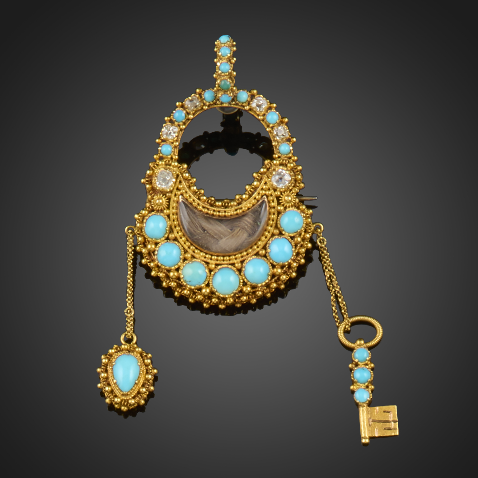 A Regency gold padlock-form brooch pendant, set overall with diamonds and turquoise cabochons, crescent-shaped glazed locket compartment containing plaited hair and suspending a turquoise-set key and pear-shaped pendant and cannetille decoration overall