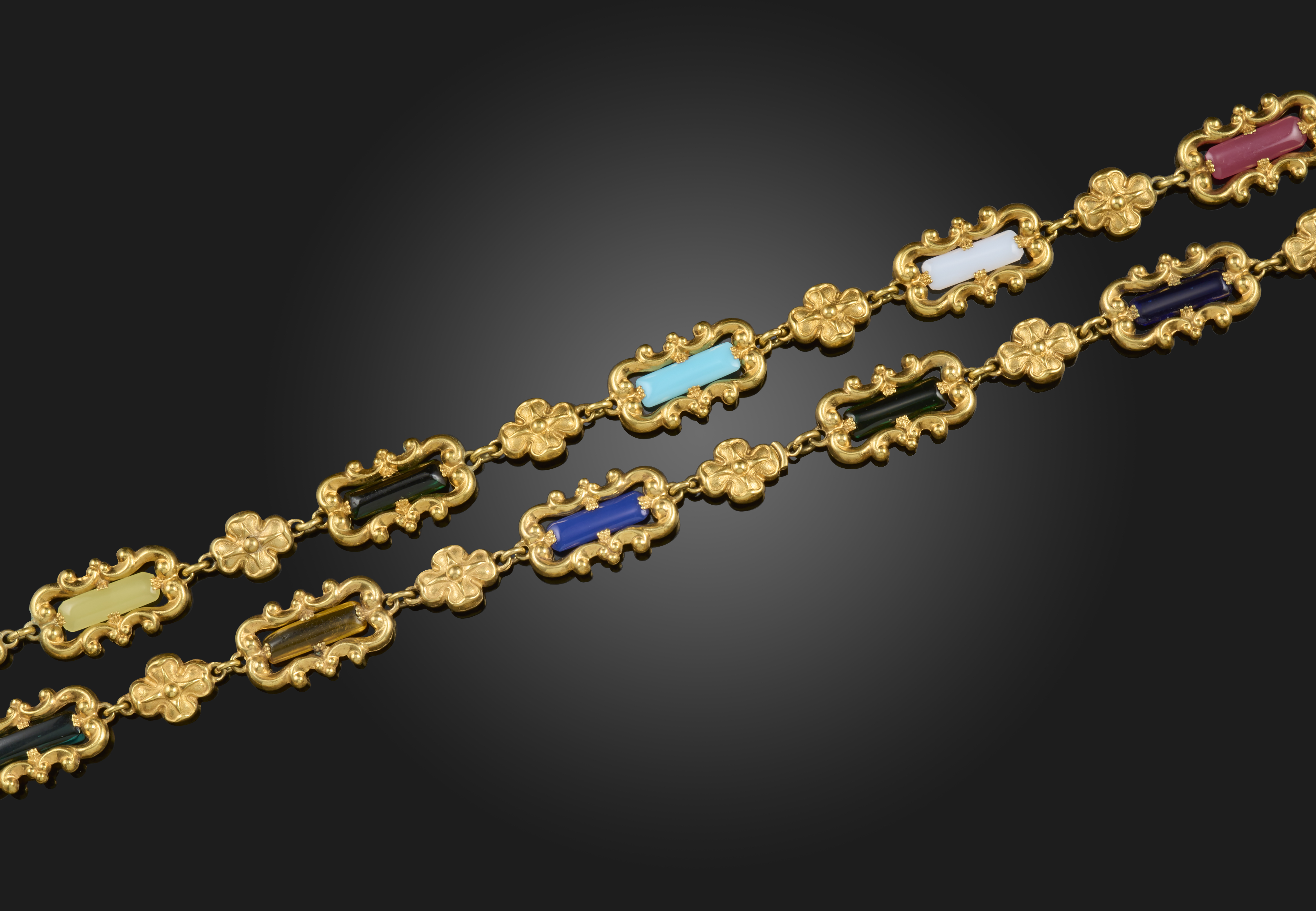 A 19th century gilt metal longuard chain, the fancy links alternate with quartrefoil and rectangular scrolling links centred with cylindrical paste stones, 85cm