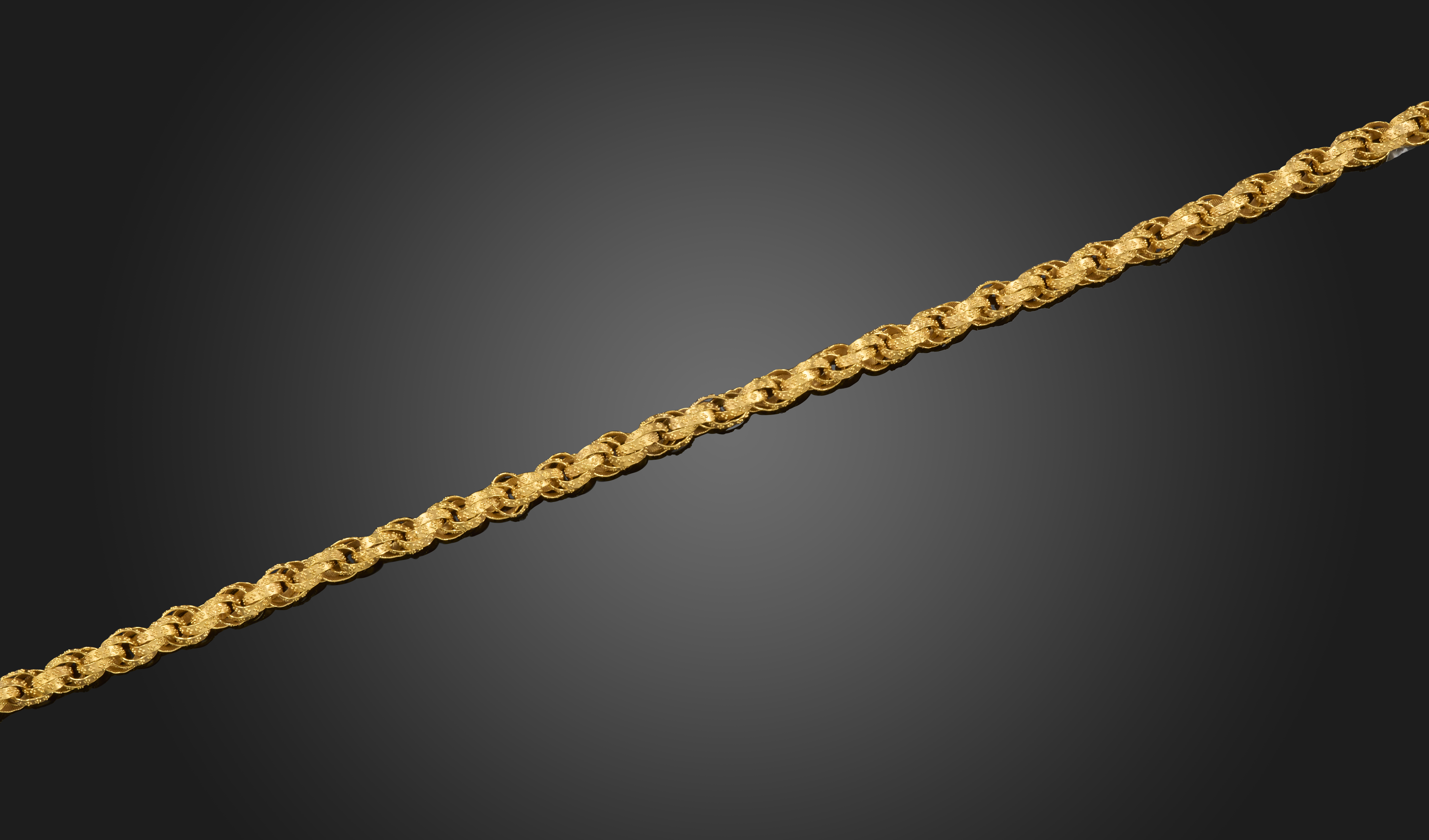 A 19th century gilt metal fancy-link guard chain, triple oval-links are decorated with pellet quatrefoils, conforming barrel clasp, 78cm
