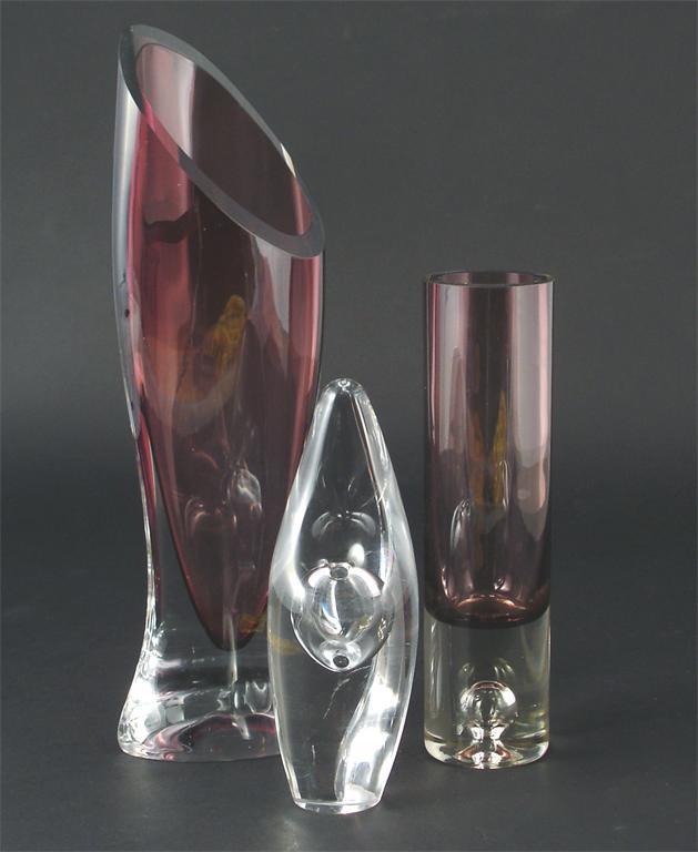 An Iittala Orchid glass vase by Timo Sarpaneva, amorphic form with air bubble, and two other glass vases etched marks 16cm. high