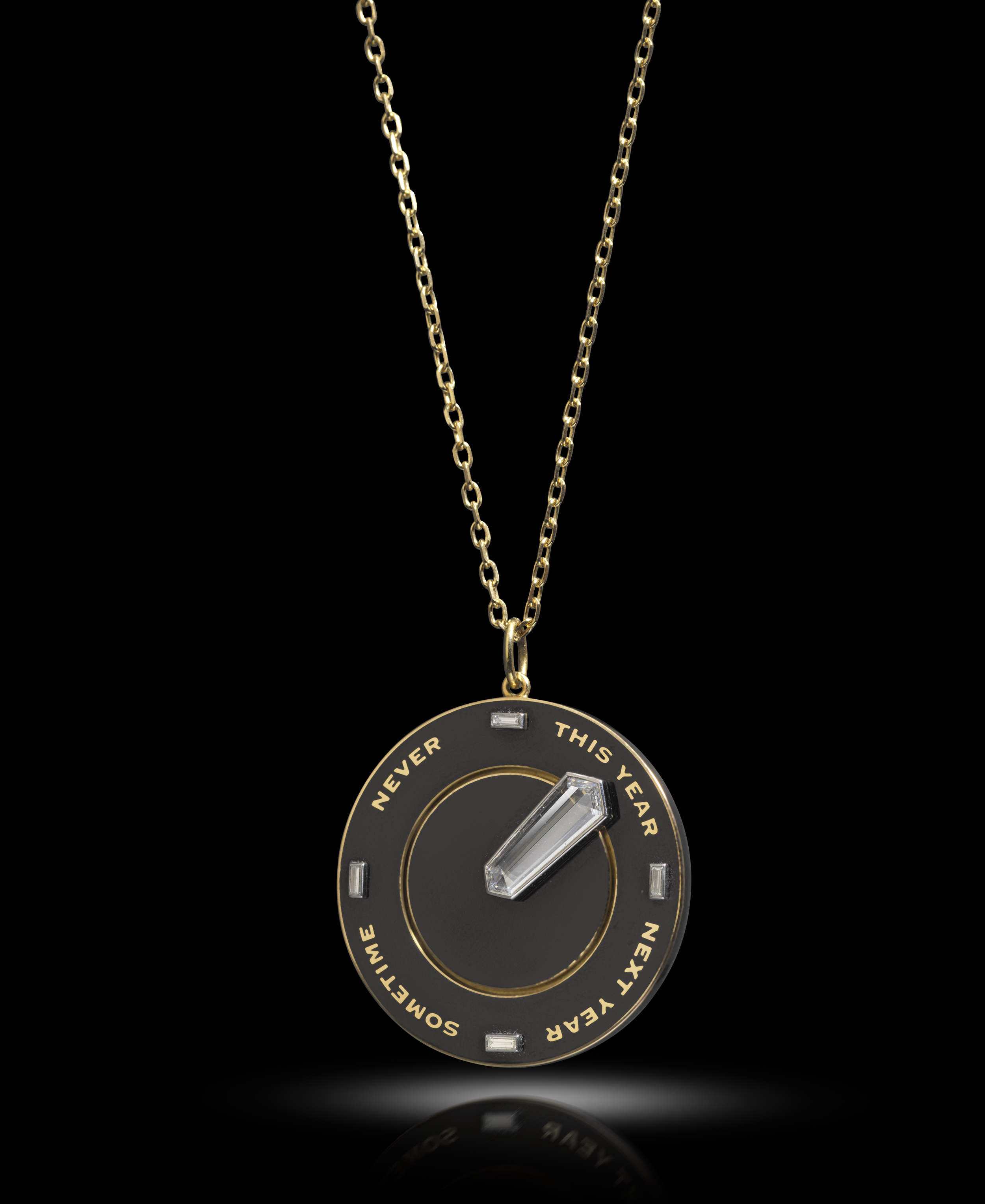 An enamel and diamond-set gold pendant, the circular pendant set with a fancy-cut diamond and quartered with baguette-shaped diamonds, the centre section rotates to point the principal diamond at the four cardinal points reading 'NEVER', 'SOMETIMES', 'THIS YEAR' and 'NEXT YEAR', on a fine-link gold neck chain, pendant 4cm high including bale, chain 72cm long
