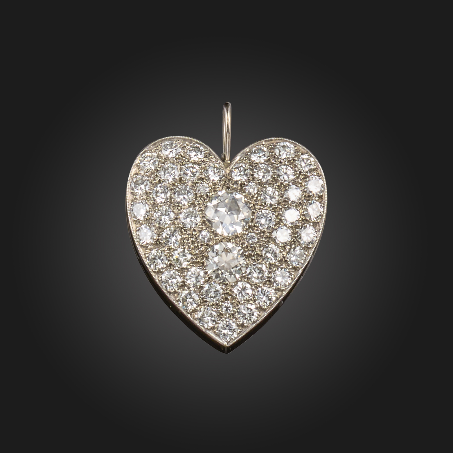 A diamond-set heart pendant, centred with two principal old circular-cut diamonds, the surround pavé-set with round brilliant-cut diamonds in palladium, principal diamonds approximately 1.00 and 0.70cts, smaller approximately 4.00cts, fitted case