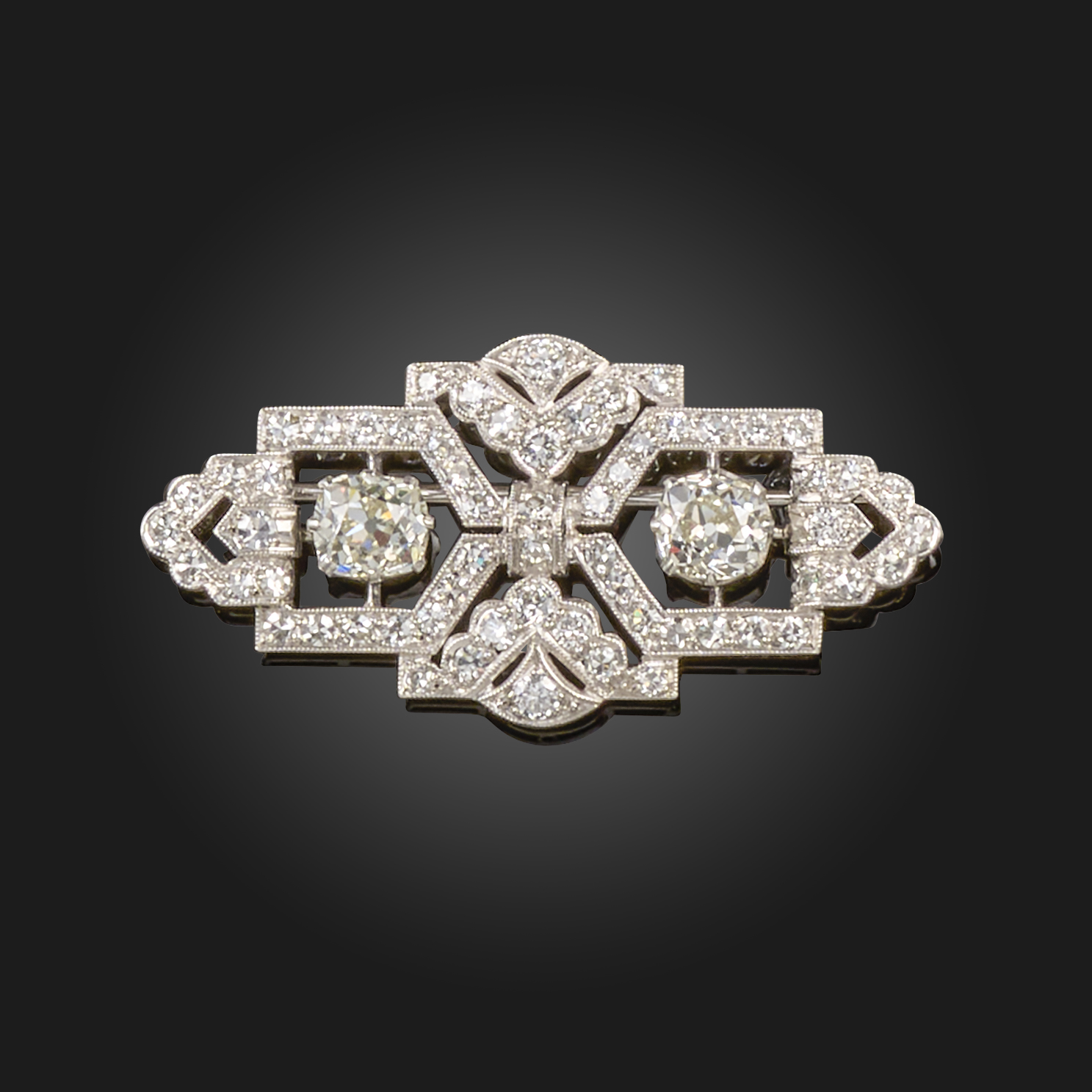 An Art Deco diamond-set brooch, the stylized bow centre section, millegrain-set overall with graduated circular-cut diamonds, with two larger old circular-cut diamonds within similar diamond-set mounts in platinum, 4.7cm wide